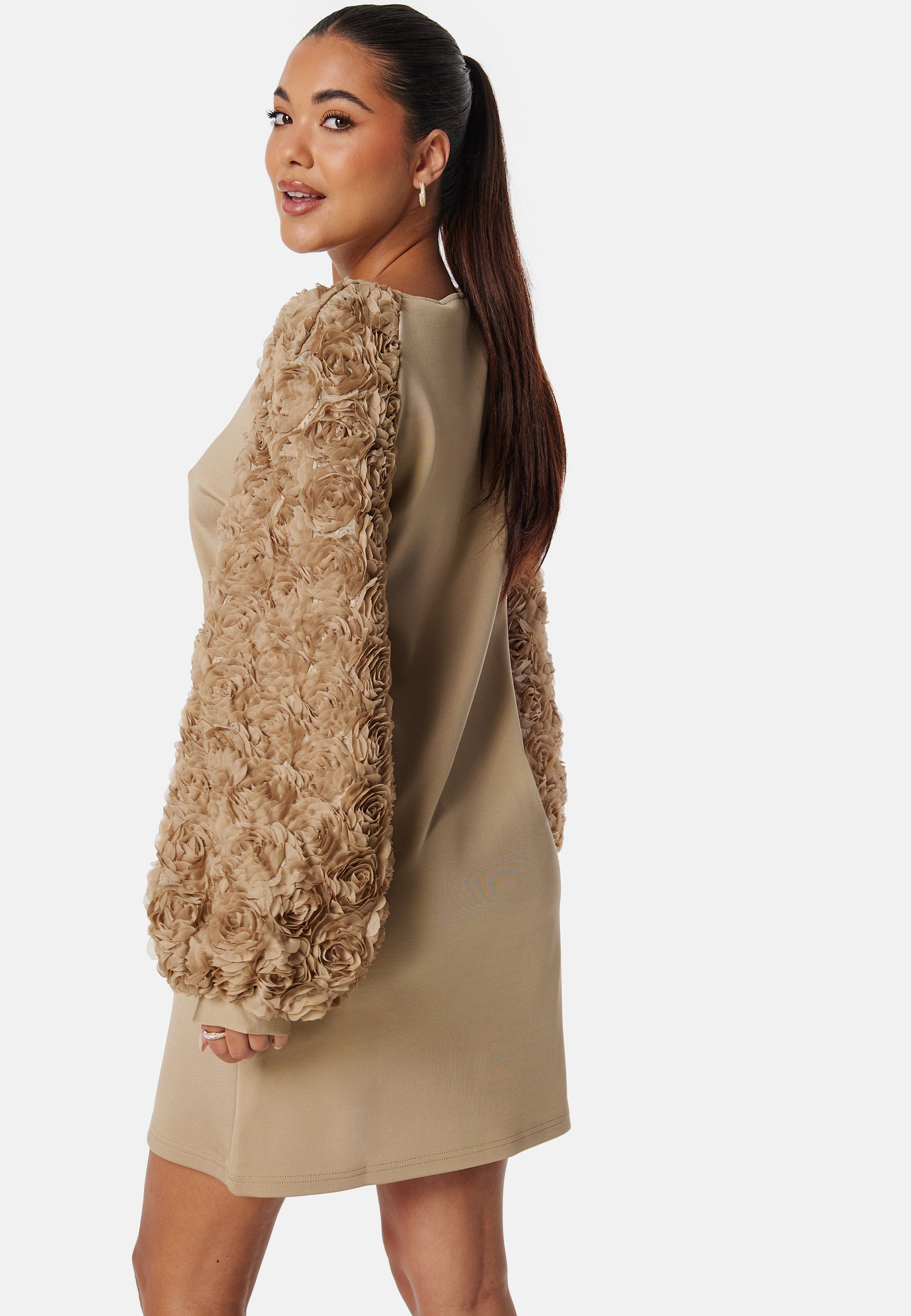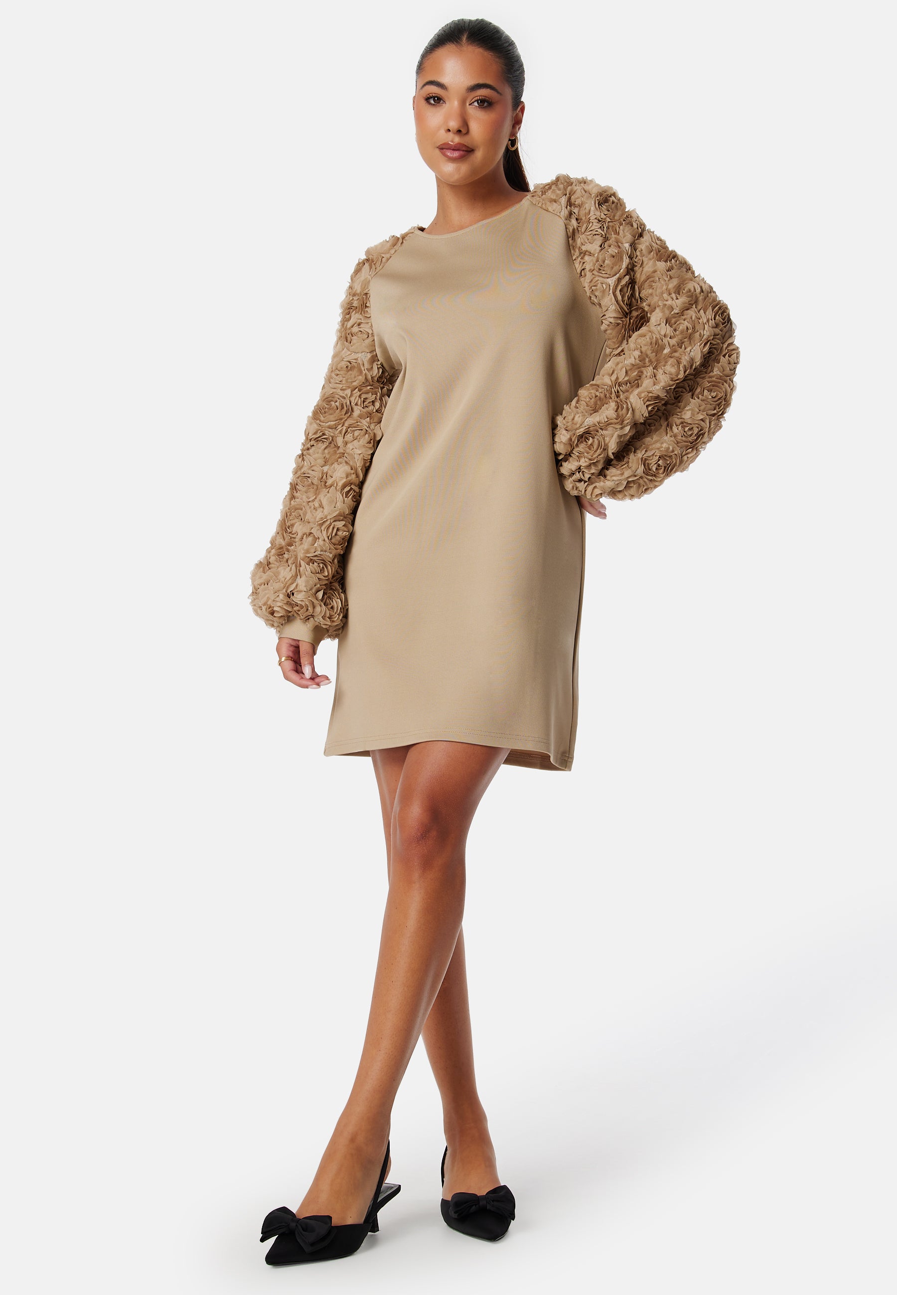 - Balloon sleeves with 3D flowers.