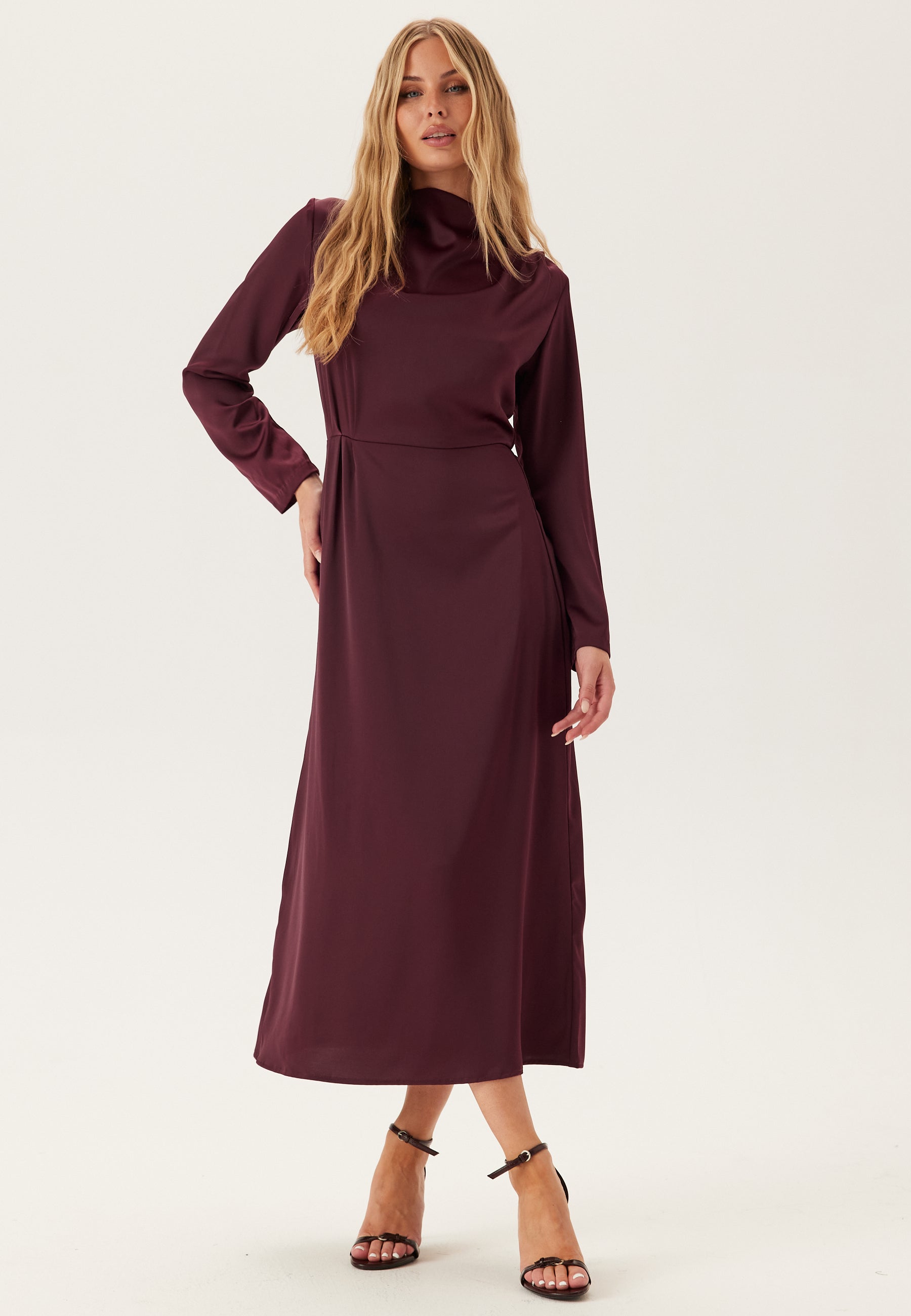 This burgundy satin midi dress is an easy evening dress for parties, dinners, and wedding guest plans, with long sleeves, a soft cowl neckline, and a fluid shape that looks polished without feeling overdone. The slightly stretchy, semi-shiny satin gives it that smooth slip-on feel, while the rich wine tone makes it stand out in a sea of basic occasionwear.