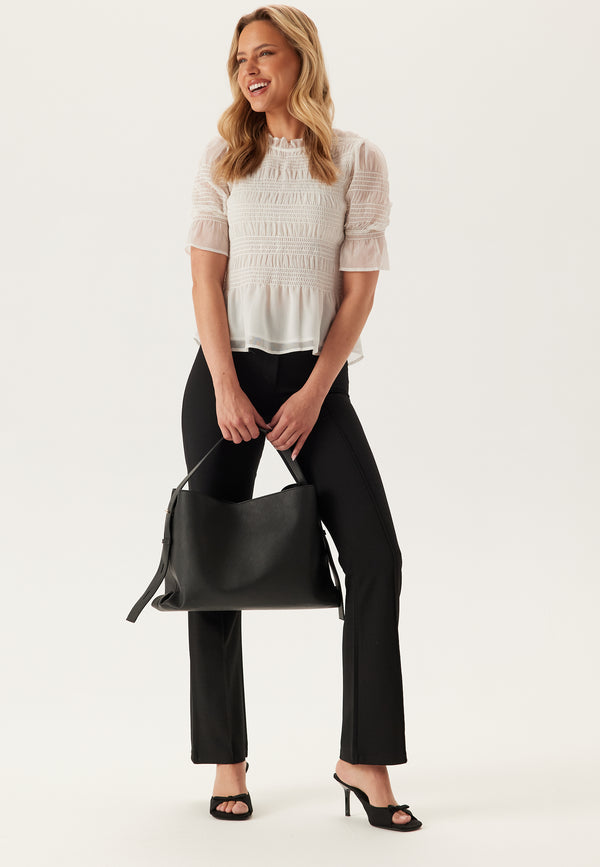 - Woven quality with a smocking at the front and at the back.