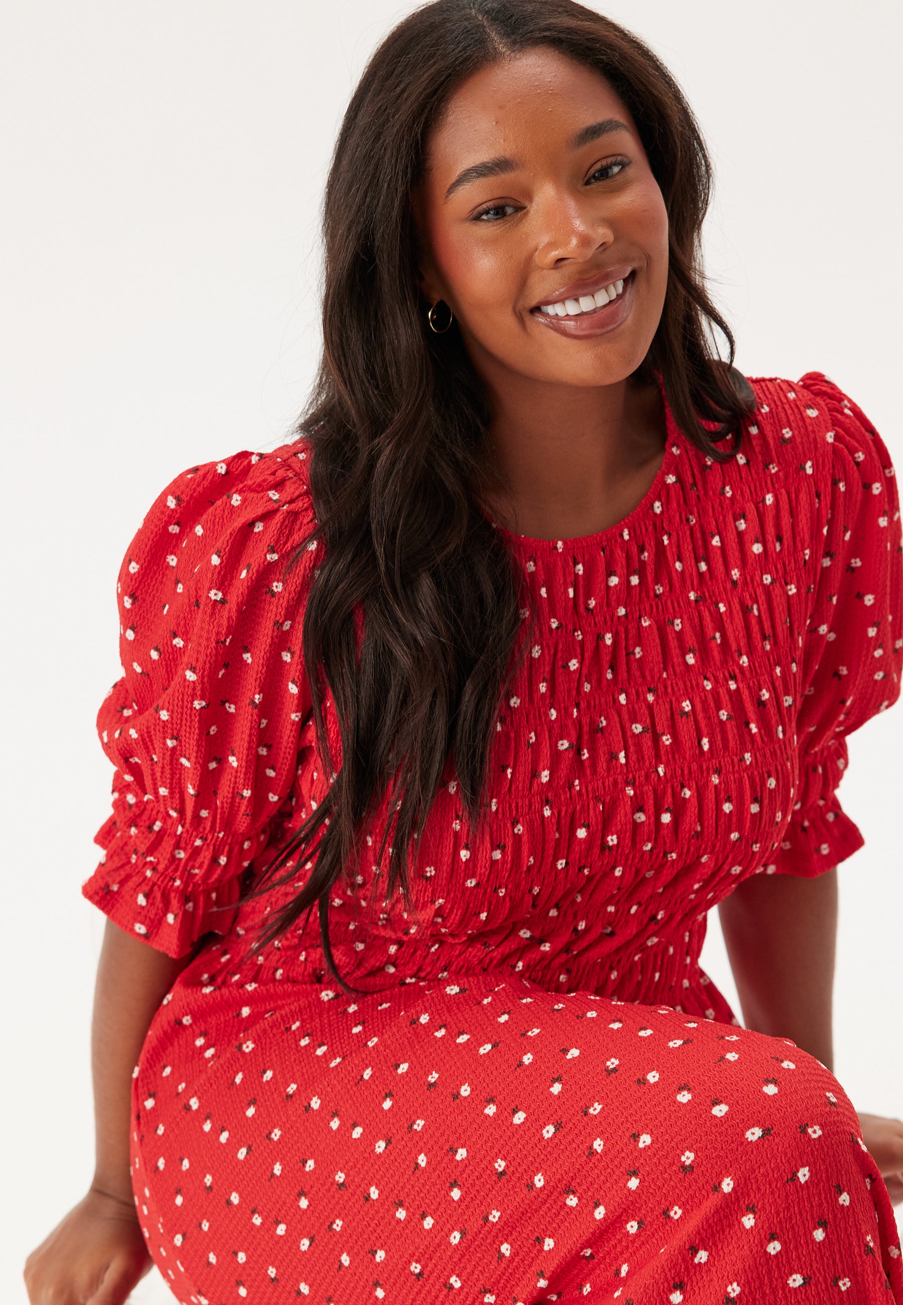 - Smocked, body-hugging fit over the bust