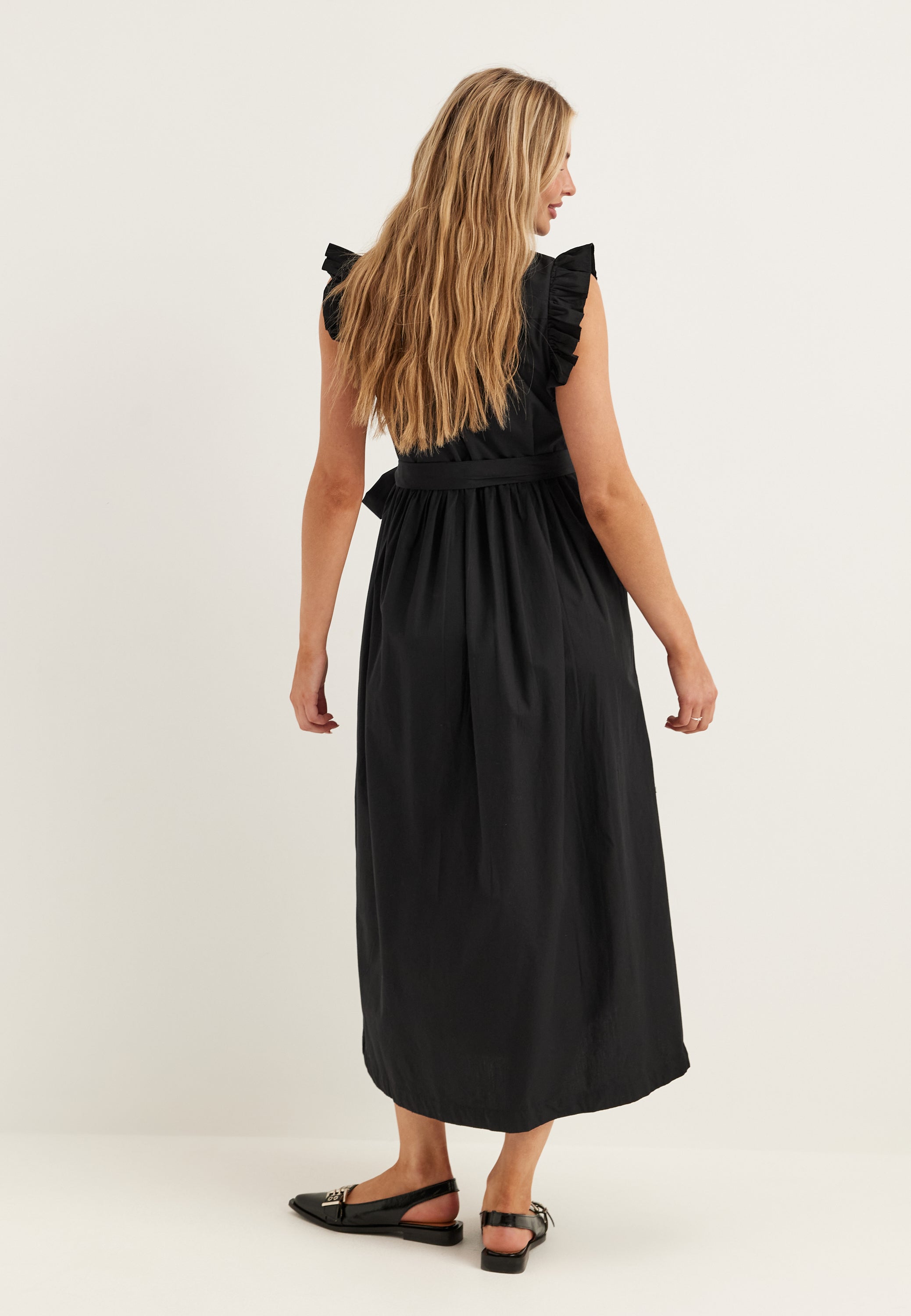 This black midi dress is an easy summer dress for everyday wear, with soft frill sleeves, a defined waist, and a full skirt that moves beautifully from daytime plans to dinner out. The woven non-stretch fabric gives it a clean, structured feel, while the crew neckline with a subtle V opening keeps the look simple and flattering.