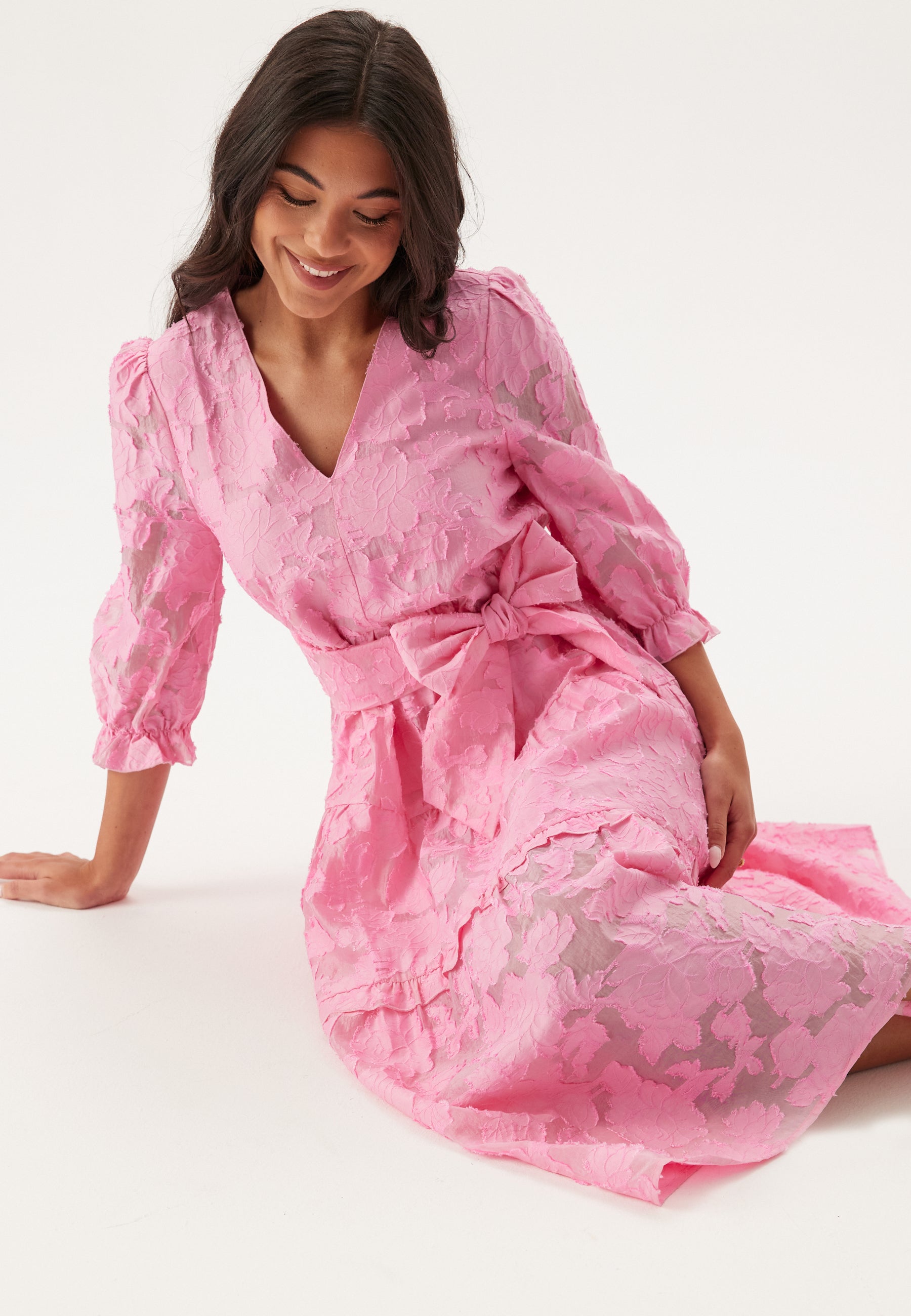The removable self-tie belt lets you define the waist or wear it looser depending on the look you want. Frill detailing at the hem adds movement, and the textured floral finish gives it more presence than a plain occasion dress, making it a lovely choice when you want something romantic but still polished.