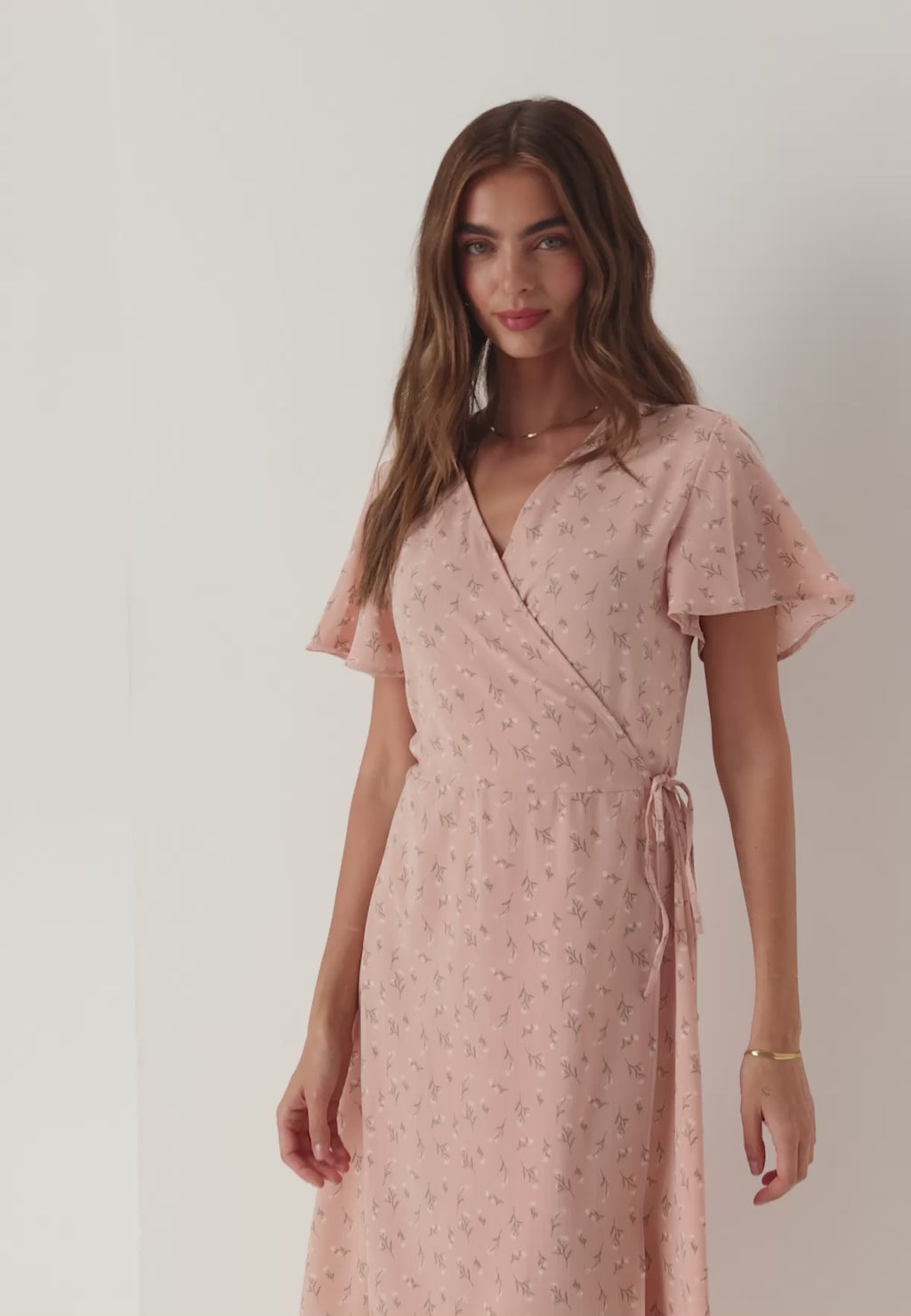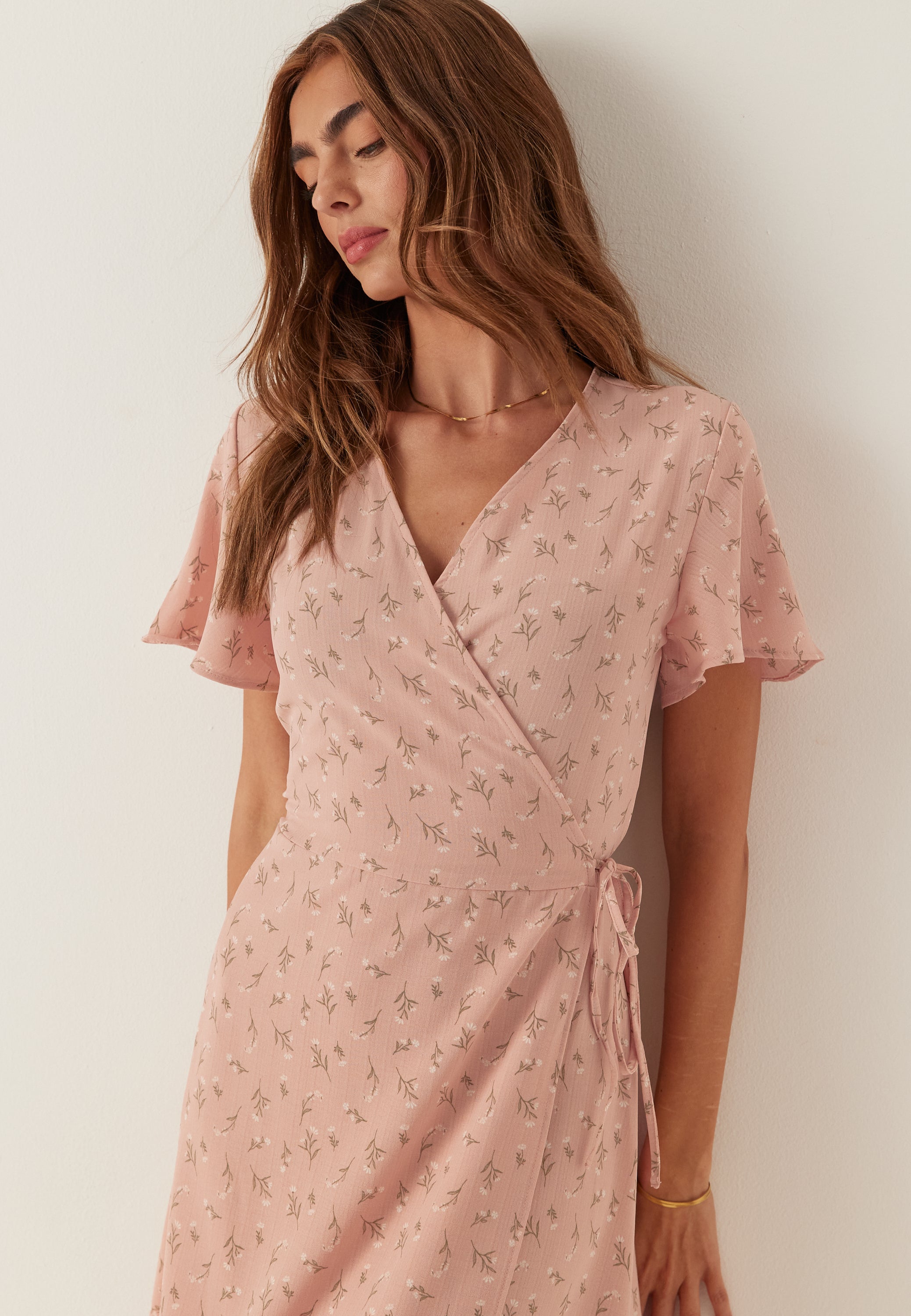 This floral wrap midi dress is an easy summer style for everyday wear, garden parties, and casual dinners when you want something light, flattering, and simple to dress up. The soft pink tone and delicate print give it a fresh, feminine feel, while the wrap front and V-shaped neckline create a shape that feels relaxed but still put together.