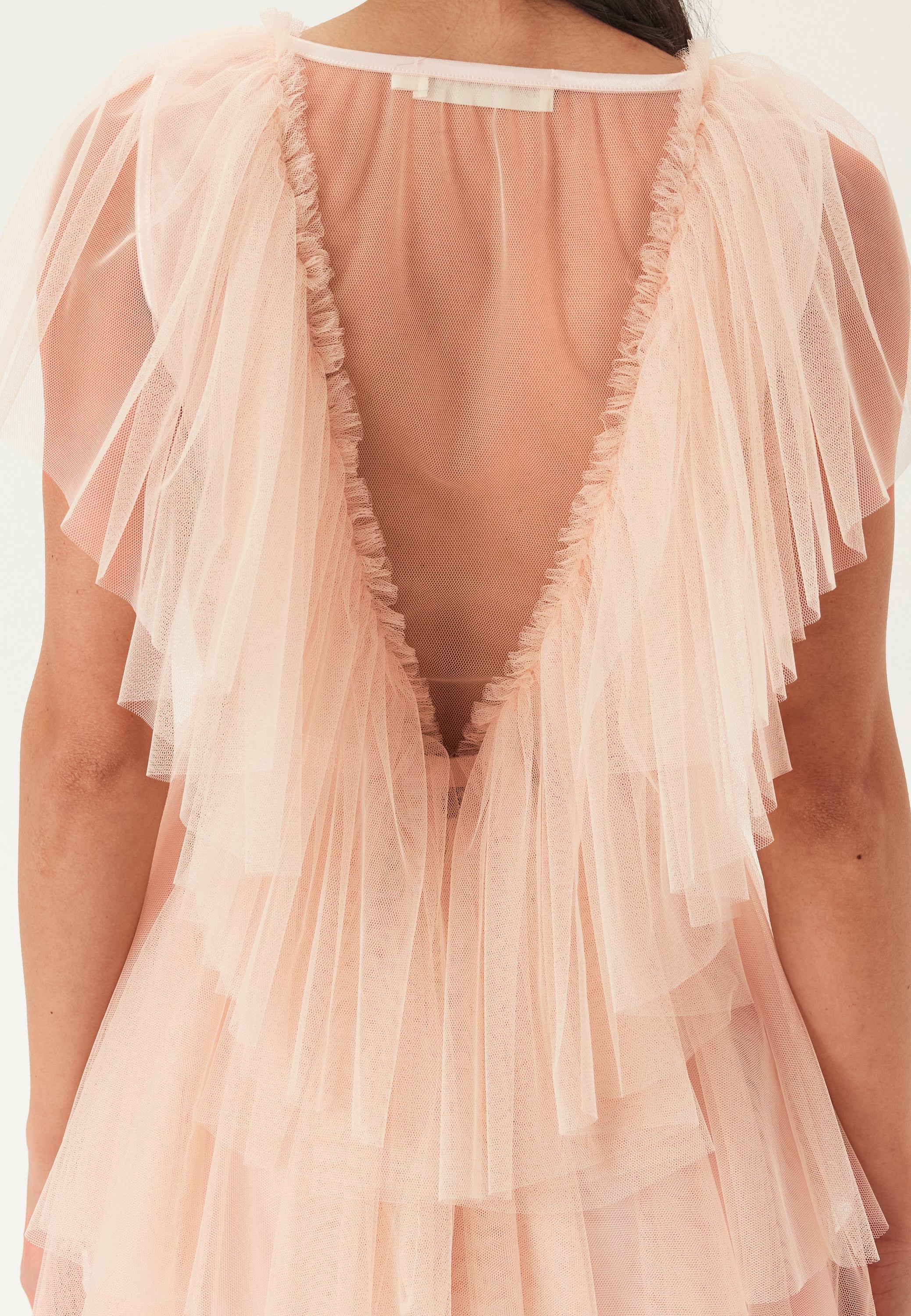 Denne pudderrosa minikjole er en kort festkjole i tyl, skabt til bryllupper, fødselsdage og alle de aftener, hvor du vil have noget let, legende og nemt at have på. Den bløde, lagdelte tyl giver kjolen et luftigt fald, mens V-udskæringen fremhæver silhuetten på en flatterende og feminin måde uden at føles for meget.