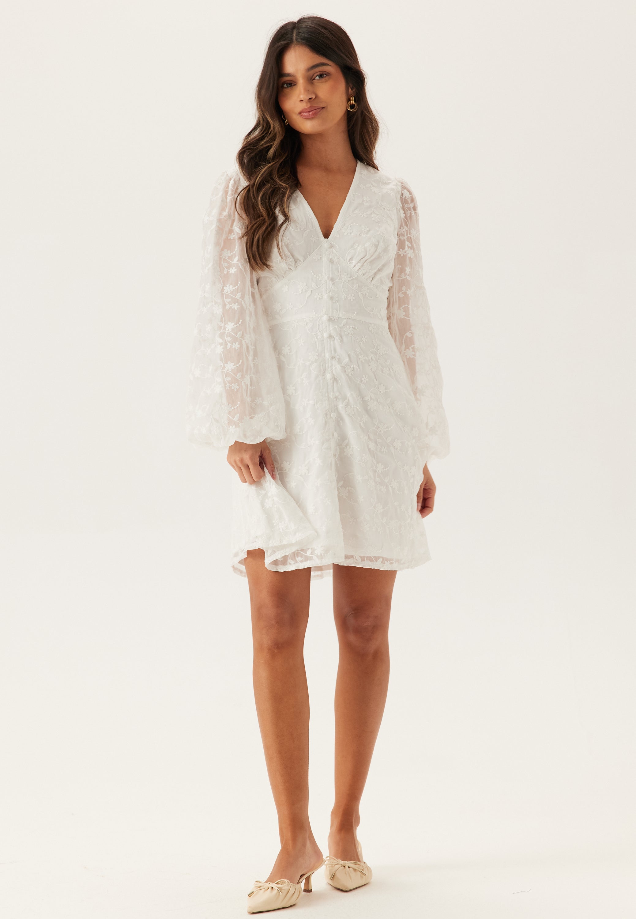 Hvis du leder efter en hvid minikjole med lange ærmer, som føles feminin og stadig er nem at have på, skiller denne sig ud med sin broderede struktur og bløde, lette silhuet. Det er den slags kjole, der føles helt rigtig til særlige øjeblikke og stadig fortjener en fast plads i garderoben, når billederne er taget.