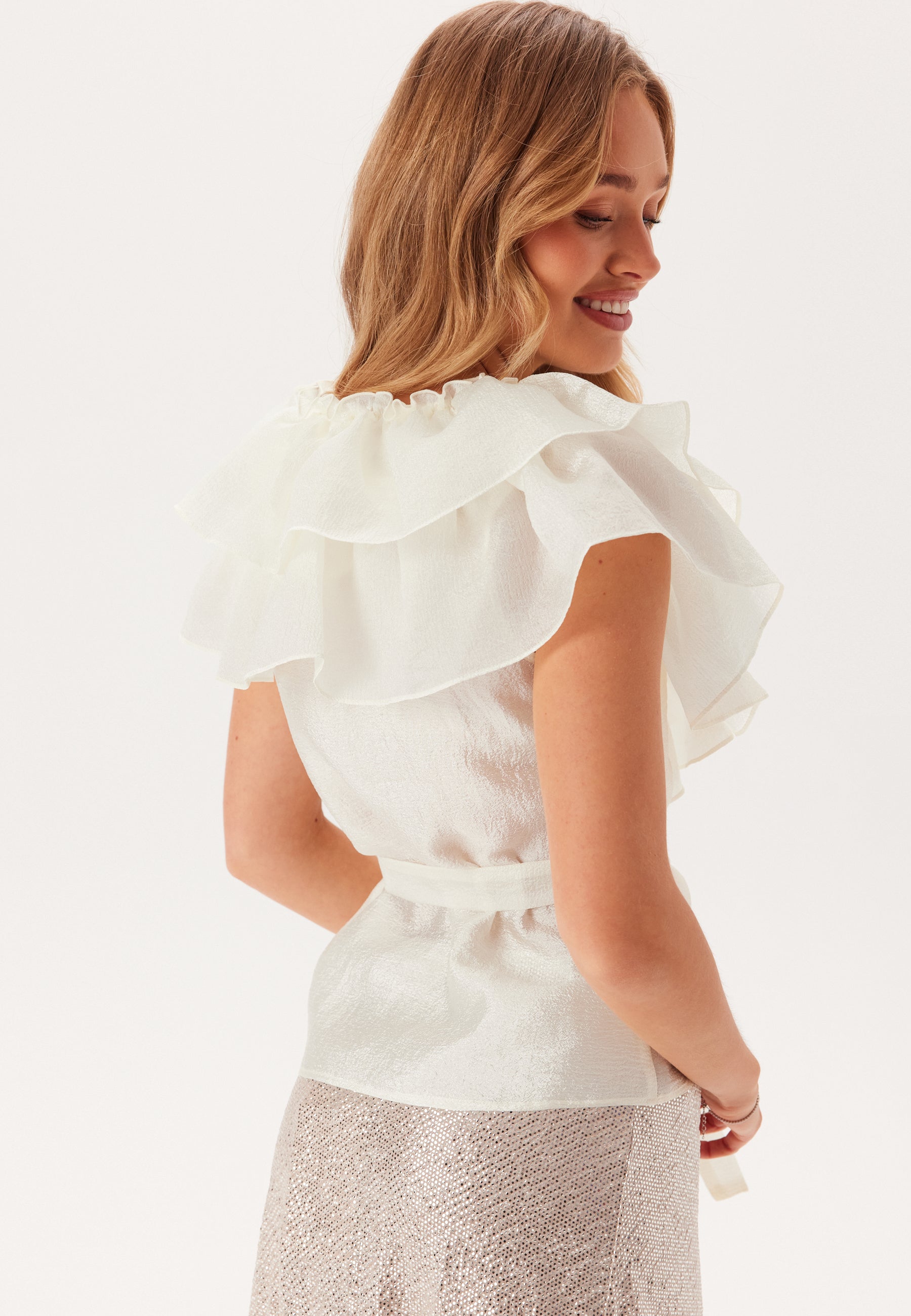 - V-udskåret halsudskæring med volanter.