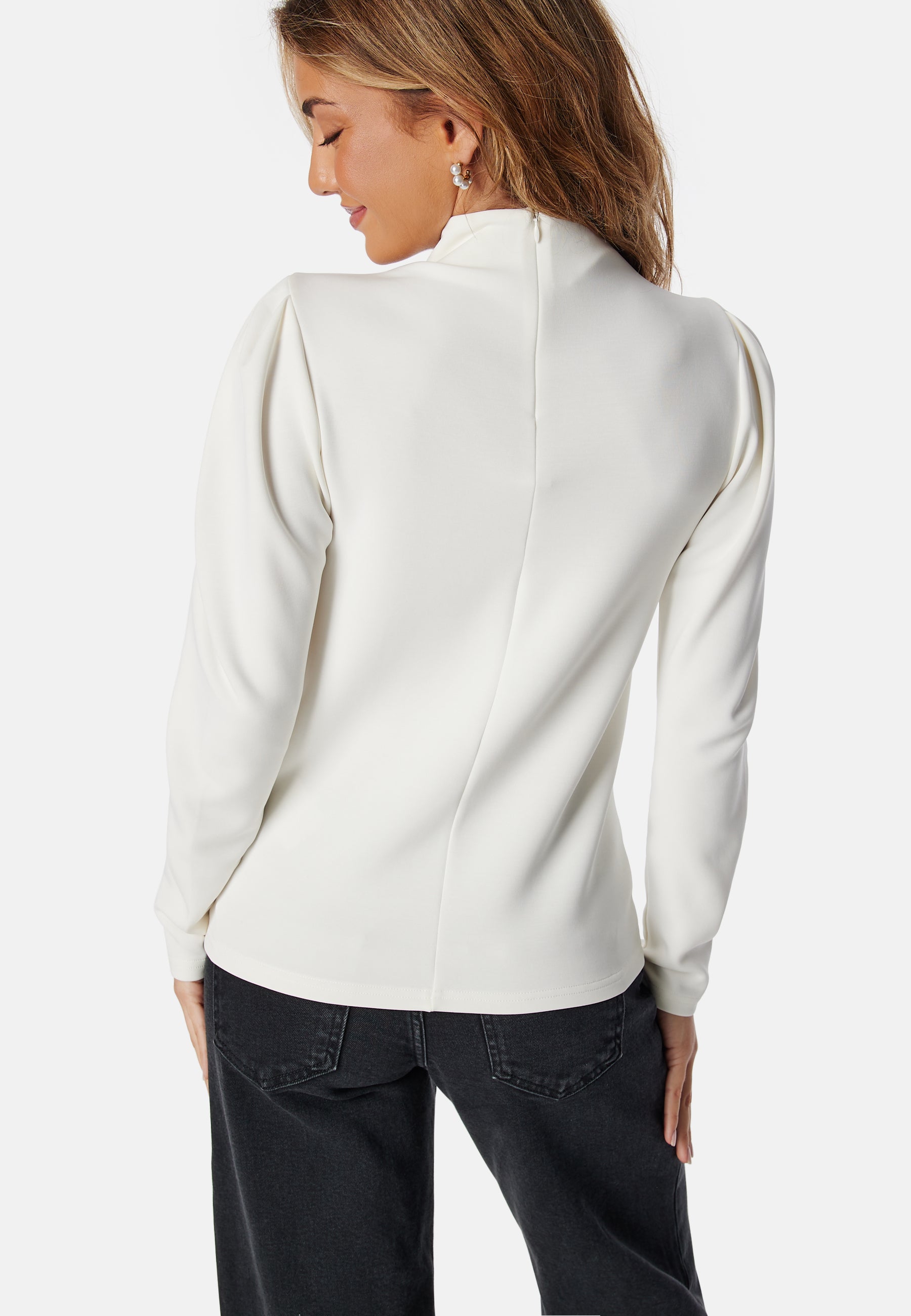 - Lav rullekrave med en skjult lynlås i nakken.