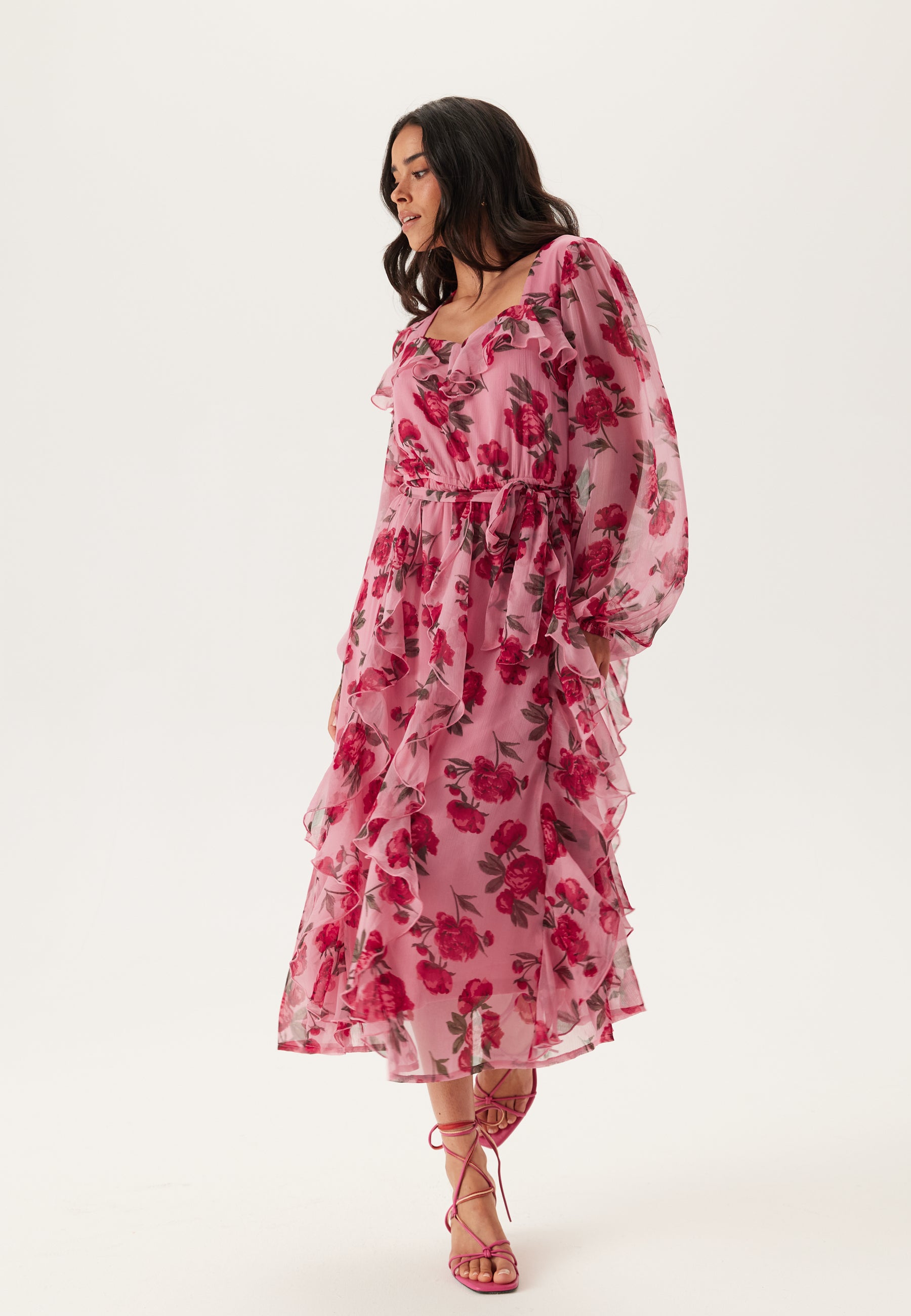Denne lyserøde blomstrede midikjole er et nemt valg til fester, middage, bryllupper og de dage, hvor du gerne vil være lidt mere klædt på uden at føle dig for pyntet. Det vævede materiale uden stræk giver et let og luftigt udtryk, mens den markerede talje med bindebånd fremhæver silhuetten på en virkelig flatterende måde.