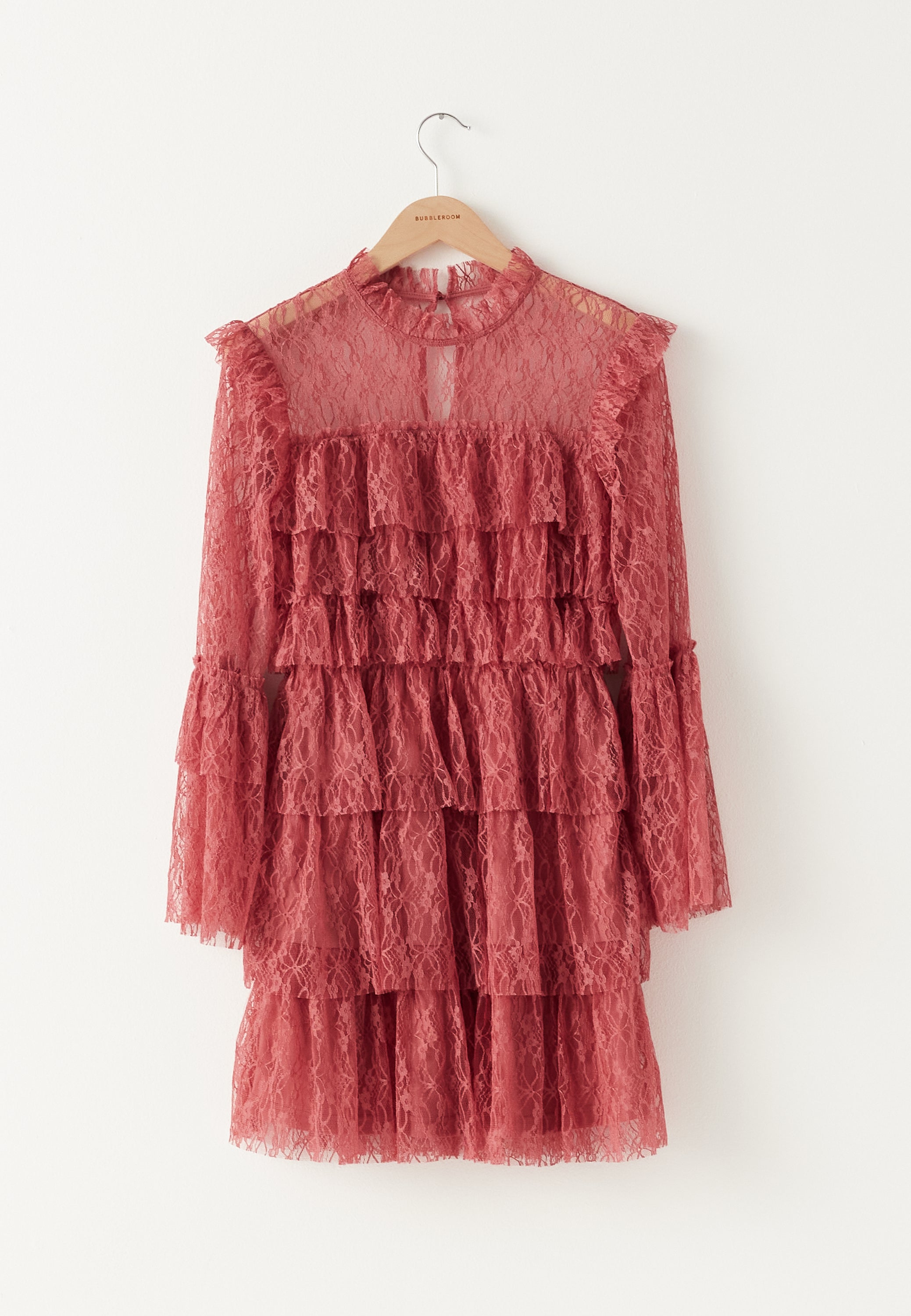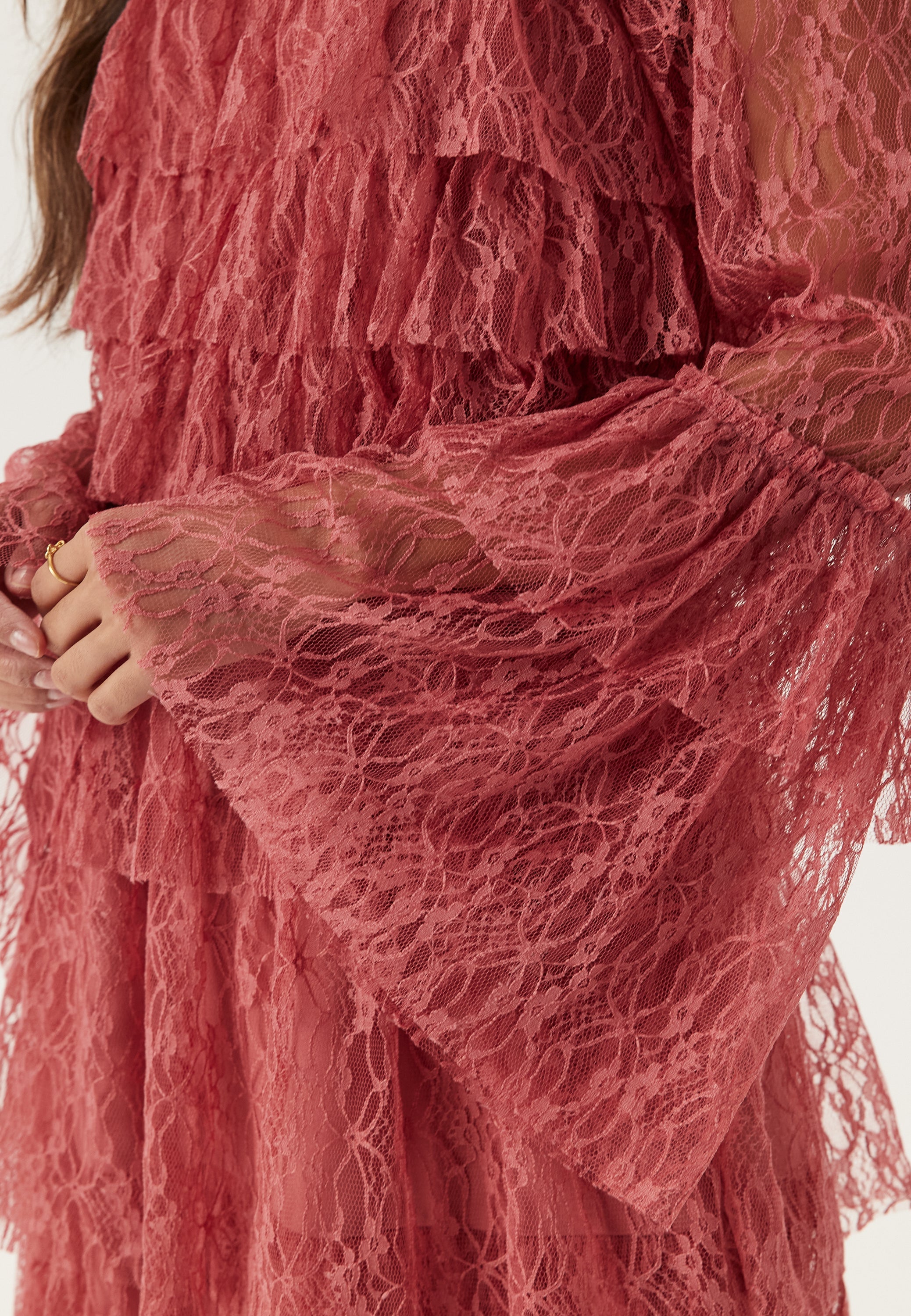 Denne langærmede minikjole lavet af vævet blonder tilbyder et romantisk, men alligevel poleret valg til fest- og aftentøj. Den klokkeformede silhuet glider blidt over kroppen, mens lagdelte flæser tilføjer tekstur og bevægelse, hvilket skaber en flatterende, feminin profil i en elegant gammel rose nuance.