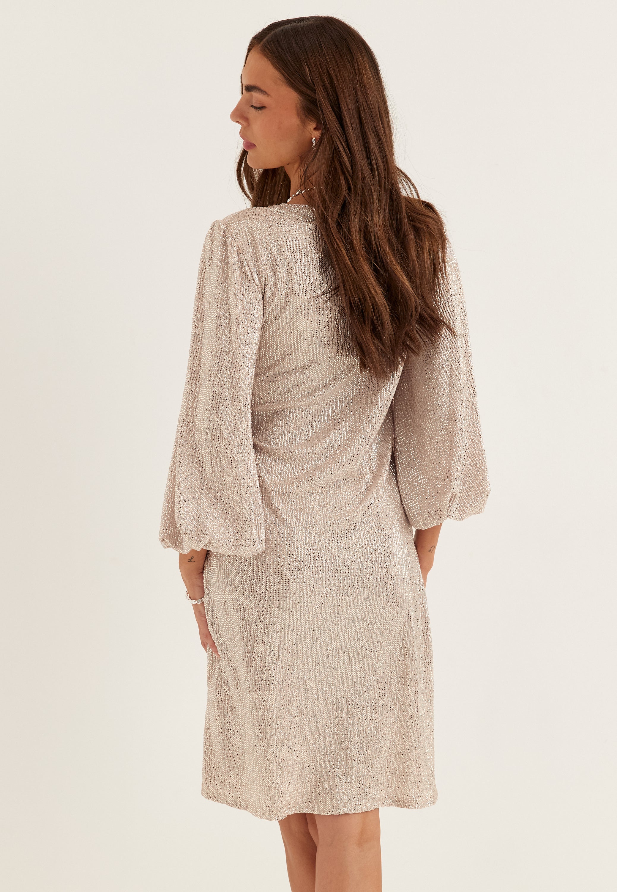 Denne glitrende minikjole er perfekt til fester, middage og særlige anledninger i højtiden, når du vil have noget, der er nemt at have på, men stadig fanger blikket. Det let skinnende stof fanger lyset smukt, mens V-udskæringen og de lange ballonærmer giver en flatterende silhuet, der føles både afslappet og pyntet.