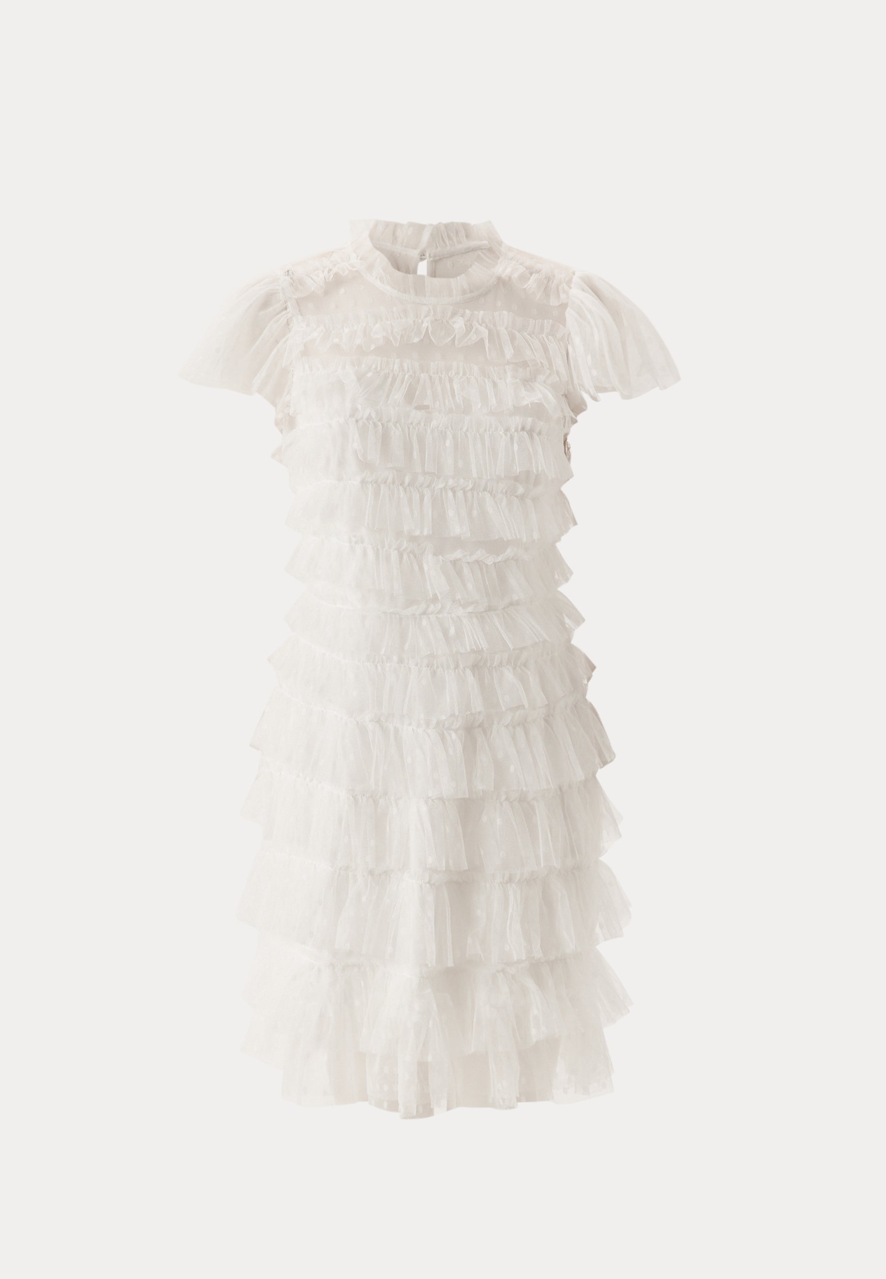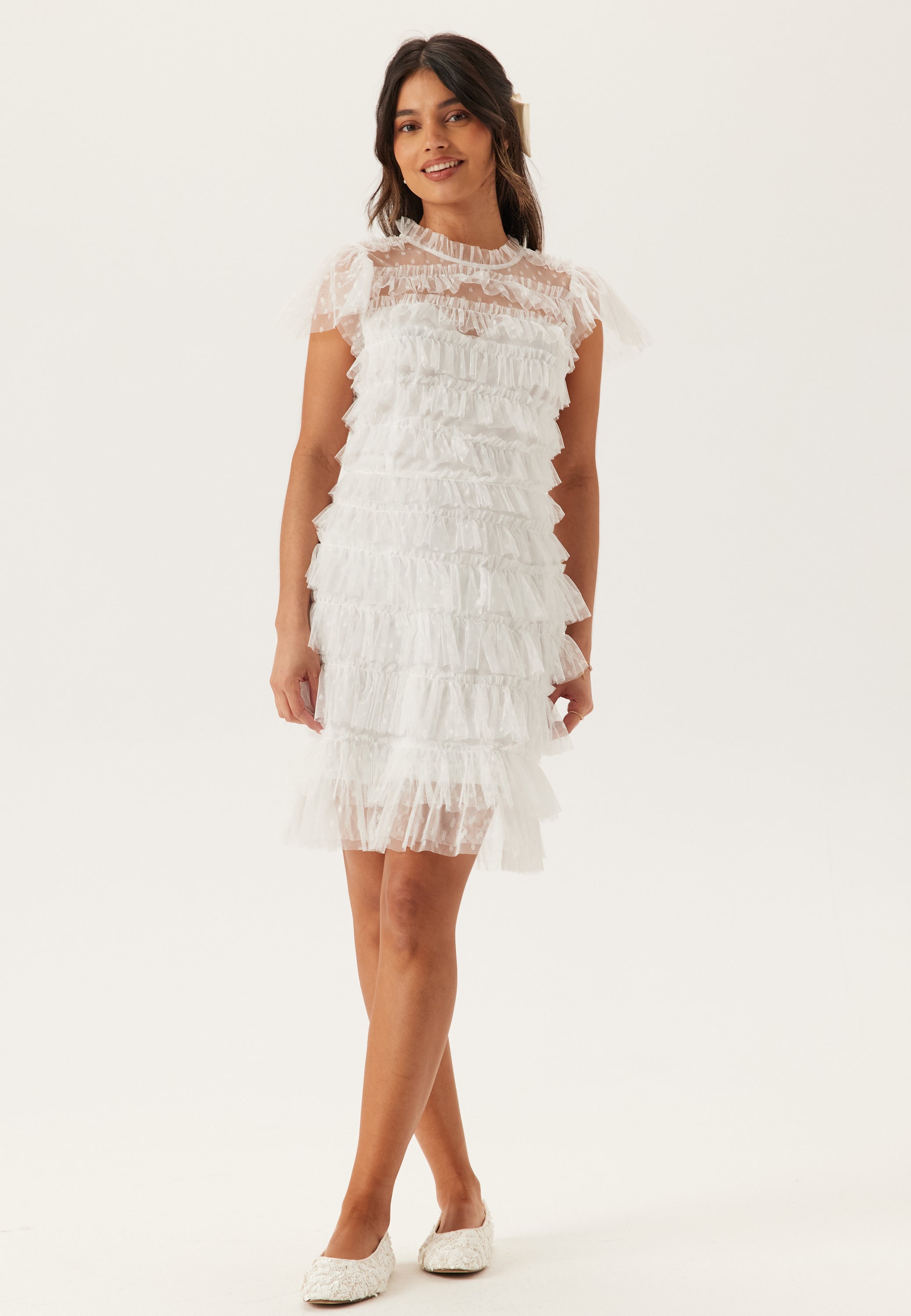 Denne hvide minikjole i prikket tyl er skabt til festlige øjeblikke – fra dimissionsfester til borgerlige bryllupper og andre anledninger, hvor du gerne vil gøre lidt ekstra ud af det. Den høje hals, de gennemsigtige korte ærmer og flæserne over det hele giver et blødt og romantisk udtryk, mens den forede krop gør den behagelig at have på hele dagen og aftenen.