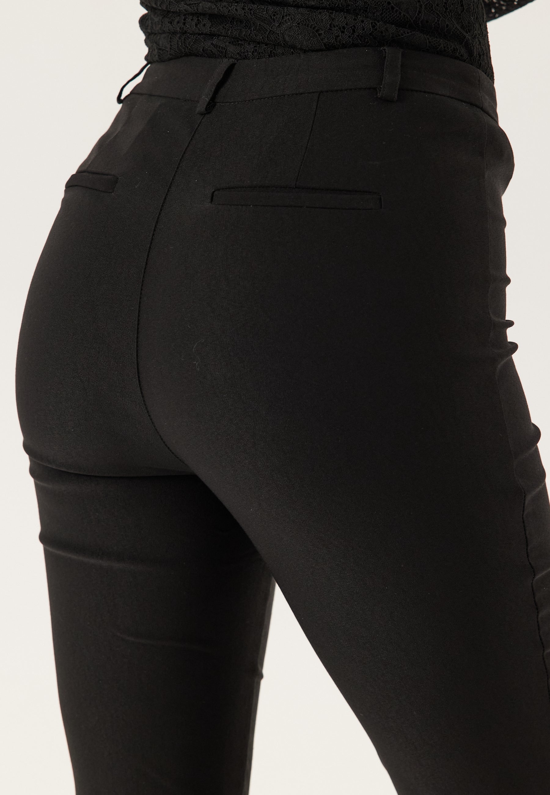 Den høje talje skaber en ren og strømlinet silhuet, mens den skjulte hægtelukning og lynlås foran giver et pænt finish. Bæltestropperne gør dem nemme at style, og de falske baglommer holder silhuetten glat og tætsiddende fra alle vinkler.