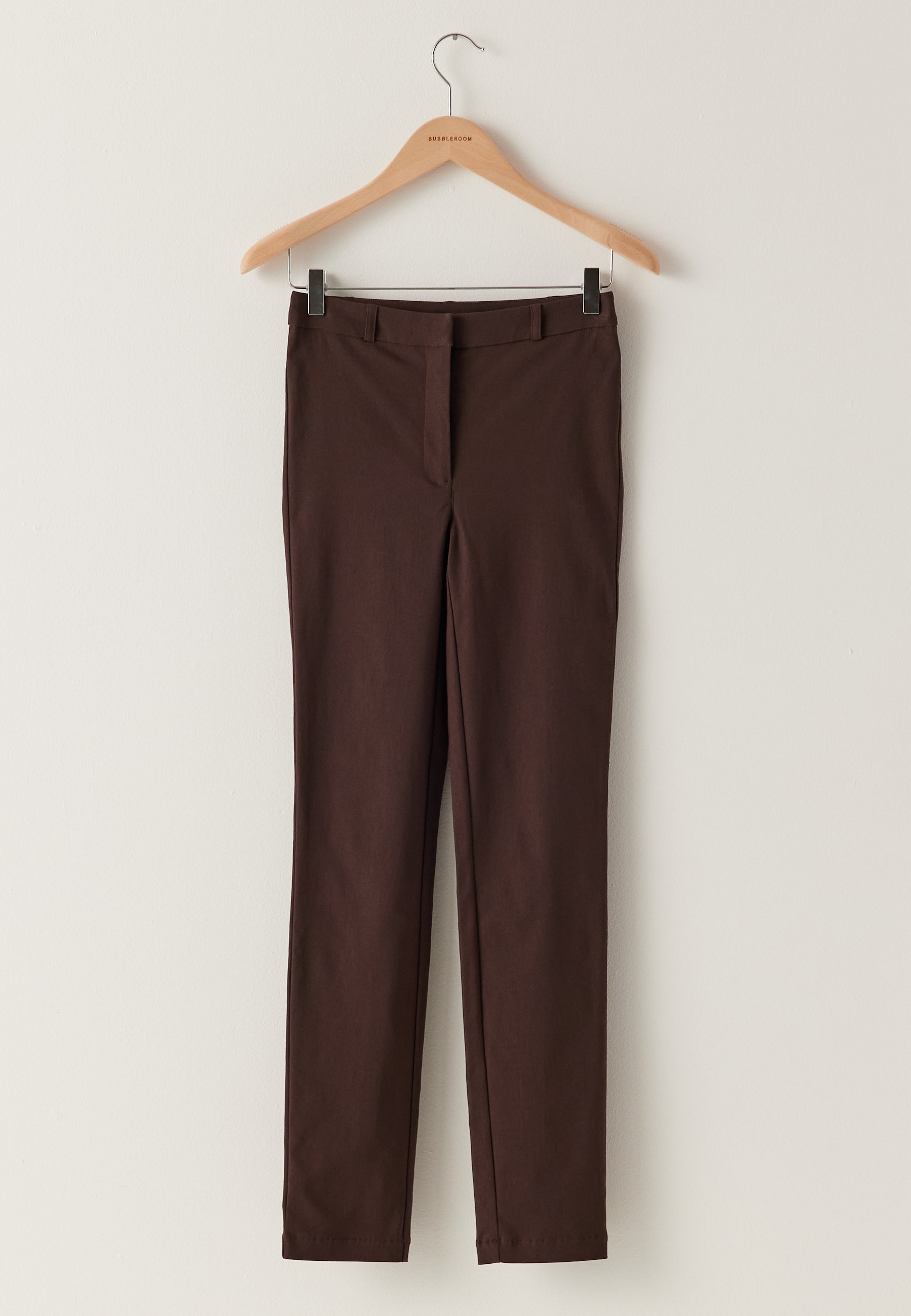 Disse mørkebrune skinnybukser er et godt valg til hverdagen, når du gerne vil have et rent og velklædt look med mere komfort end klassiske habitbukser. Den høje talje giver en flot silhuet, mens det strækbare bengalinestof gør dem behagelige at bevæge sig i – fra arbejdsdage til middagsaftaler.