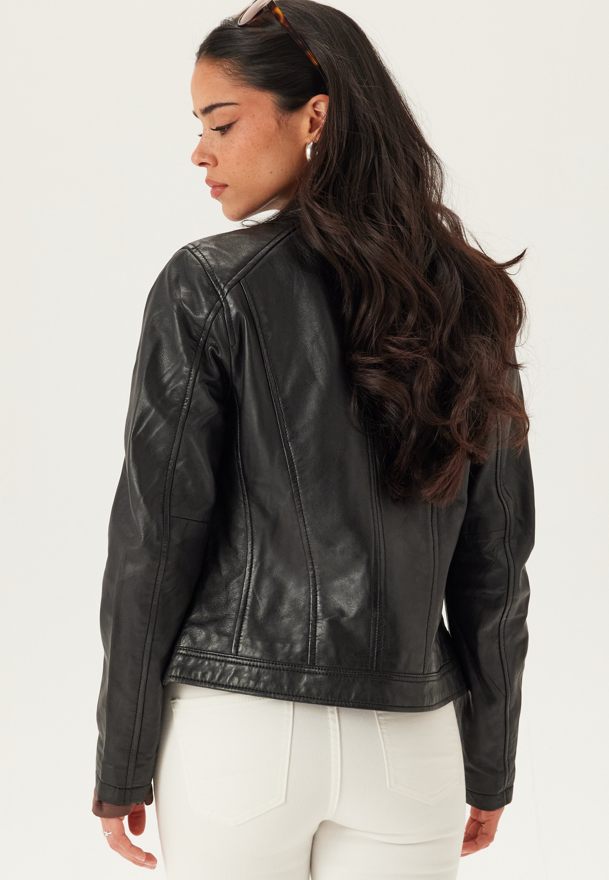 Denne sorte læderjakke er et nemt valg til hverdagen om foråret, efteråret og på kølige aftener, når du gerne vil have noget enkelt, let og stilrent at tage på. Den rene lynlåslukning foran og den kraveløse halsudskæring giver et mere strømlinet look end en klassisk bikerjakke, så den fungerer lige godt over en T-shirt og jeans som til en strikkjole eller et par skræddersyede bukser.