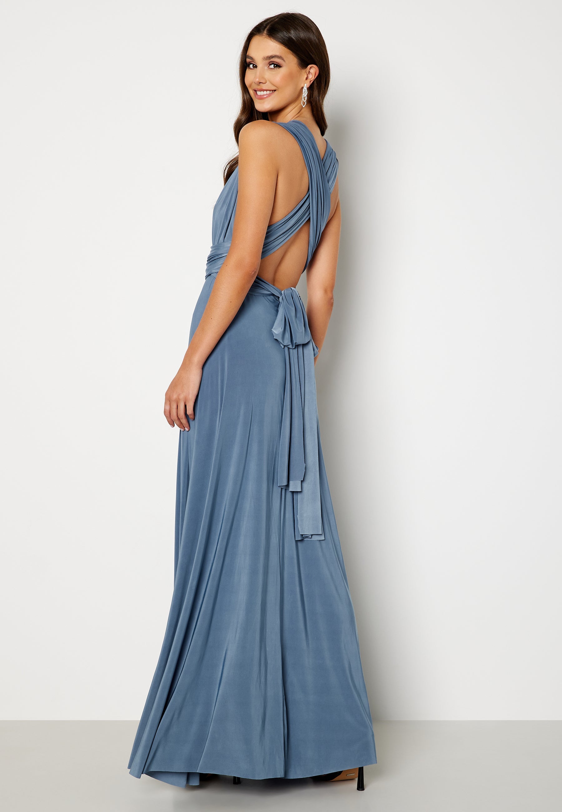 Denne maxi-kjole med bindebånd er en blød, skyblå aftenkjole skabt til bryllupper, brudepigeopgaver, gallafester og andre anledninger, hvor du gerne vil være klædt fint på uden at gå på kompromis med komforten. Den strækbare jersey falder flot langs kroppen, mens den dybe V-udskæring, den åbne skulderlinje og den markerede talje skaber en smigrende, flydende silhuet, som er behagelig at have på hele aftenen.