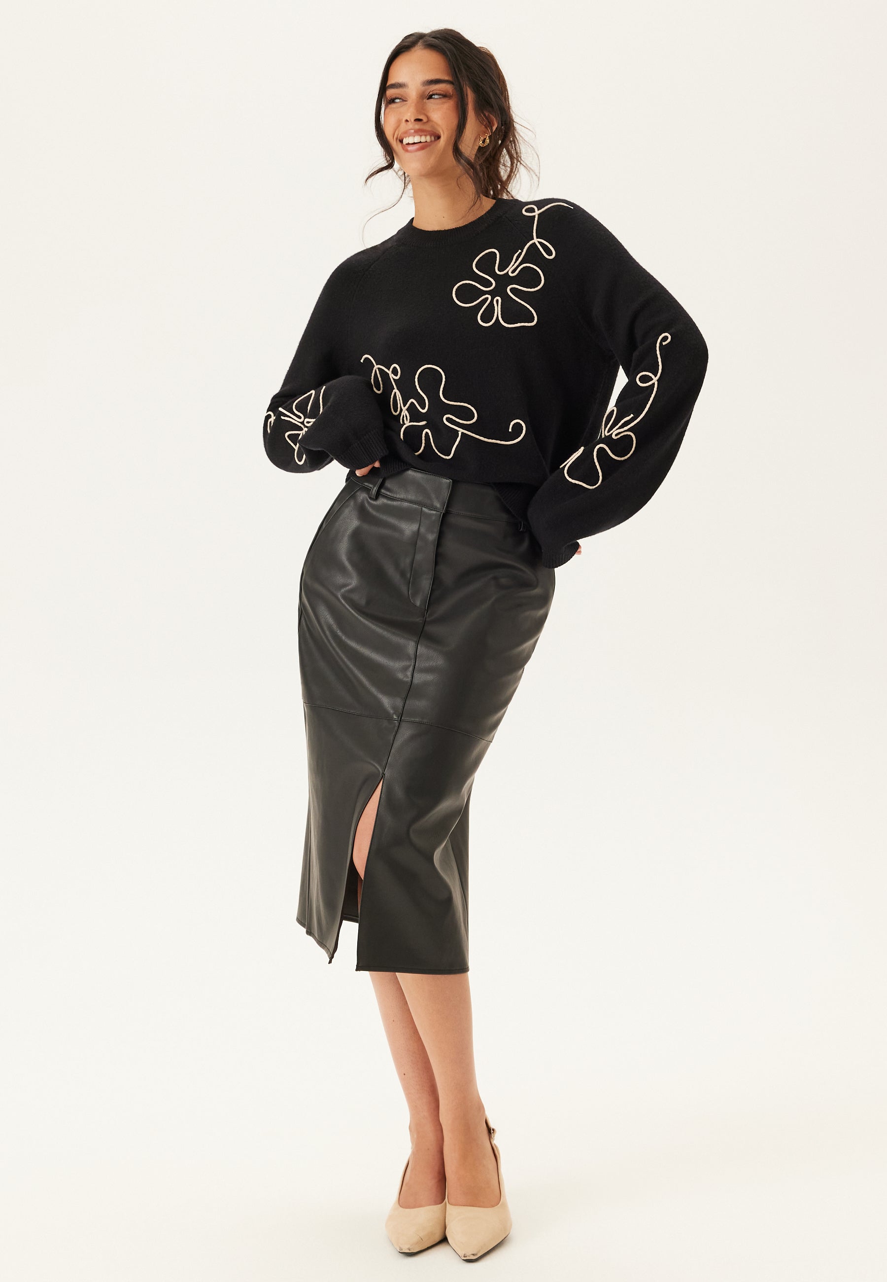Denne sorte striktrøje er en nem hverdagsfavorit med en blød følelse, en almindelig pasform og fine påsyede detaljer foran og på ærmerne. Det er den slags strik, der får et enkelt outfit til at føles lidt mere gennemtænkt – uanset om du styler den med pæne bukser til middag eller læderlook-bukser og støvler til en aften ude.
