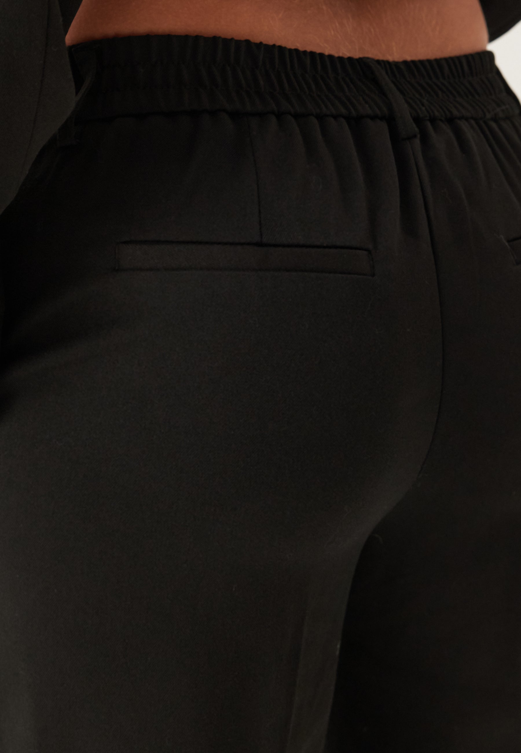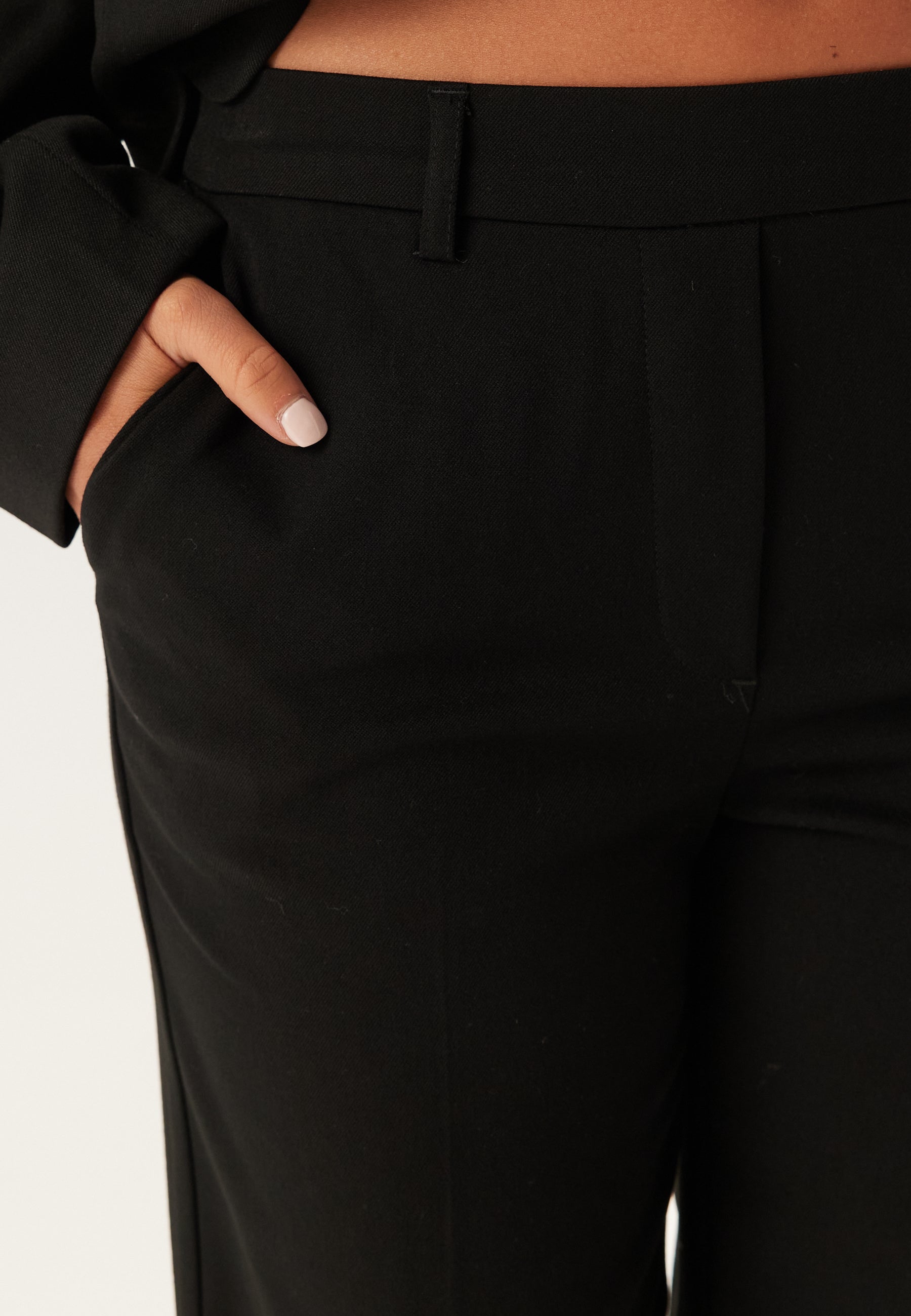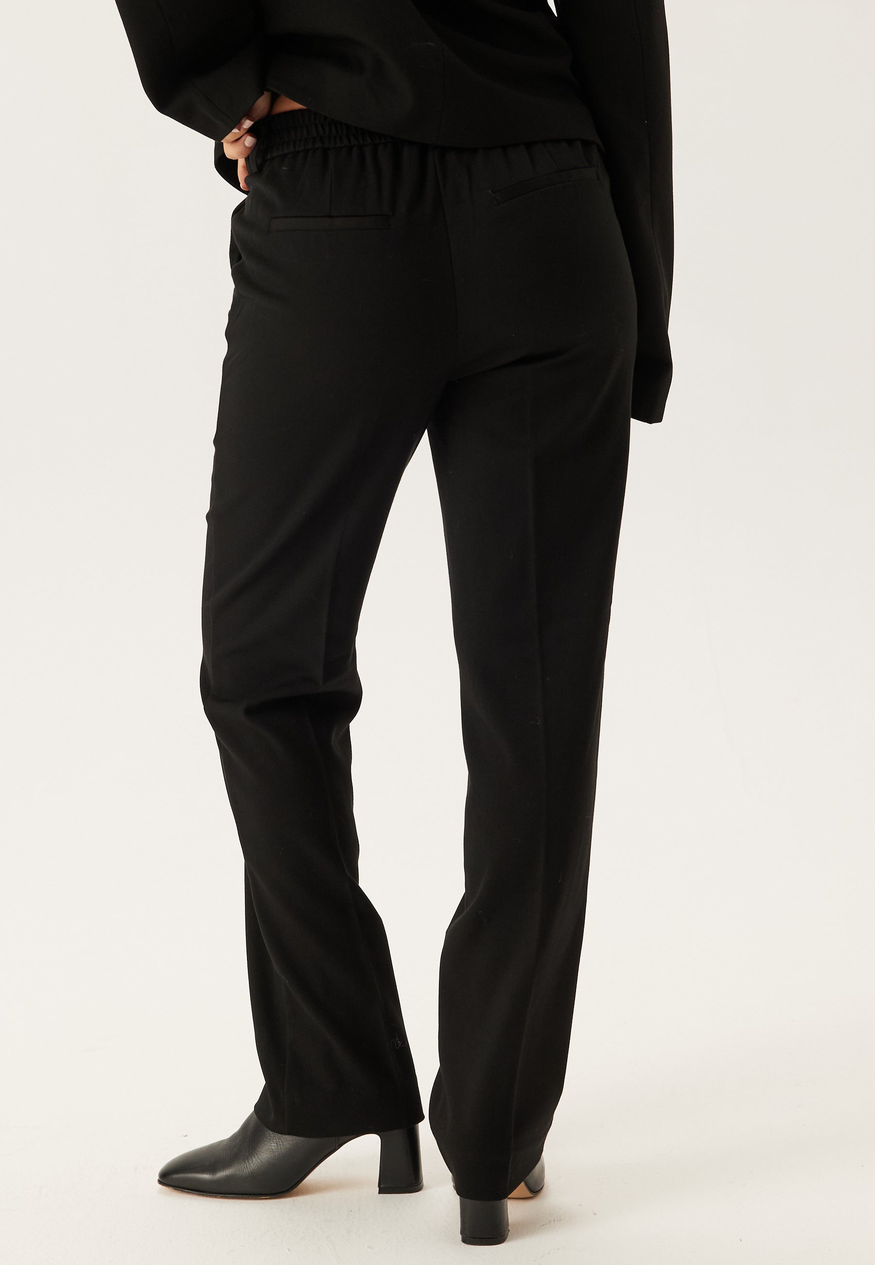 Disse sorte bukser med lige ben er et nemt og velklædt valg til arbejde, middage og de dage, hvor du gerne vil se skarp ud uden at gå på kompromis med komforten. Den mellemhøje talje og det rene, lige snit giver en pæn og flatterende silhuet, mens det vævede materiale med stretch gør dem behagelige at have på fra morgen til aften.