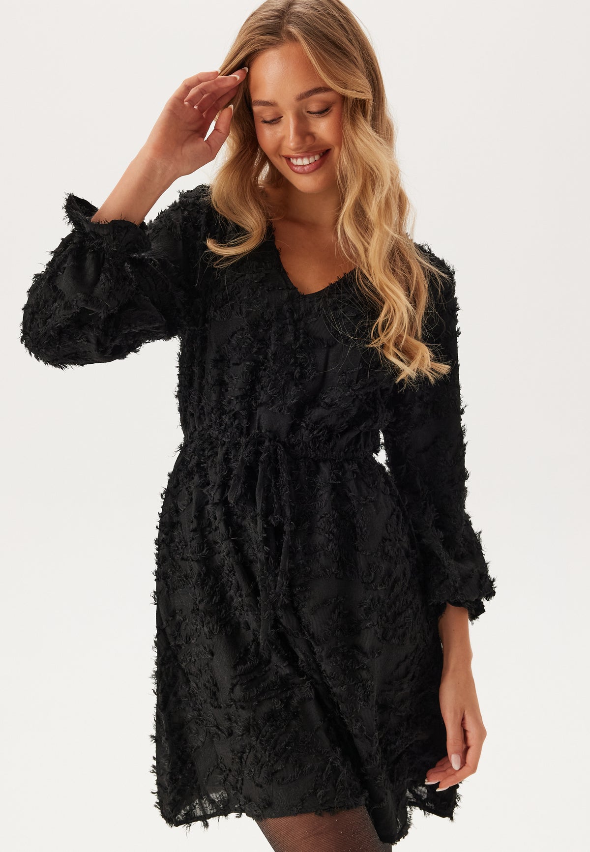- Markeret talje med elastik og dekorativ knudedetalje.