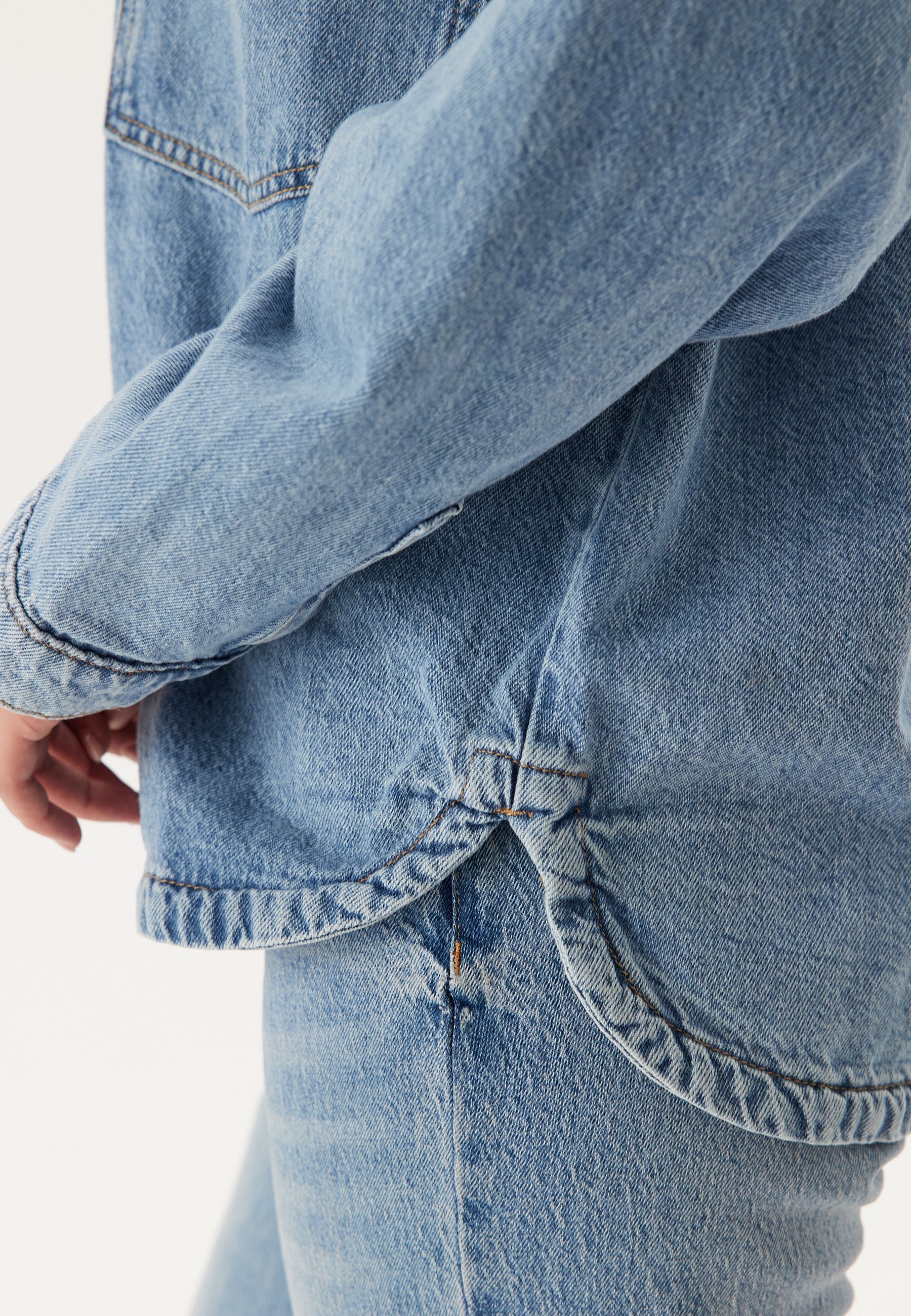 Denne oversized denimskjorte er et nemt lag til hverdagen og passer perfekt til afslappede outfits. Den har en lys blå vask, klassisk skjortekrave og en løs pasform, der fungerer lige godt knappet helt op som åben over en T-shirt. Den vævede denim uden stretch giver den den faste fornemmelse, man gerne vil have i en ægte denimskjorte, mens den rummelige pasform gør den behagelig og afslappet at have på.