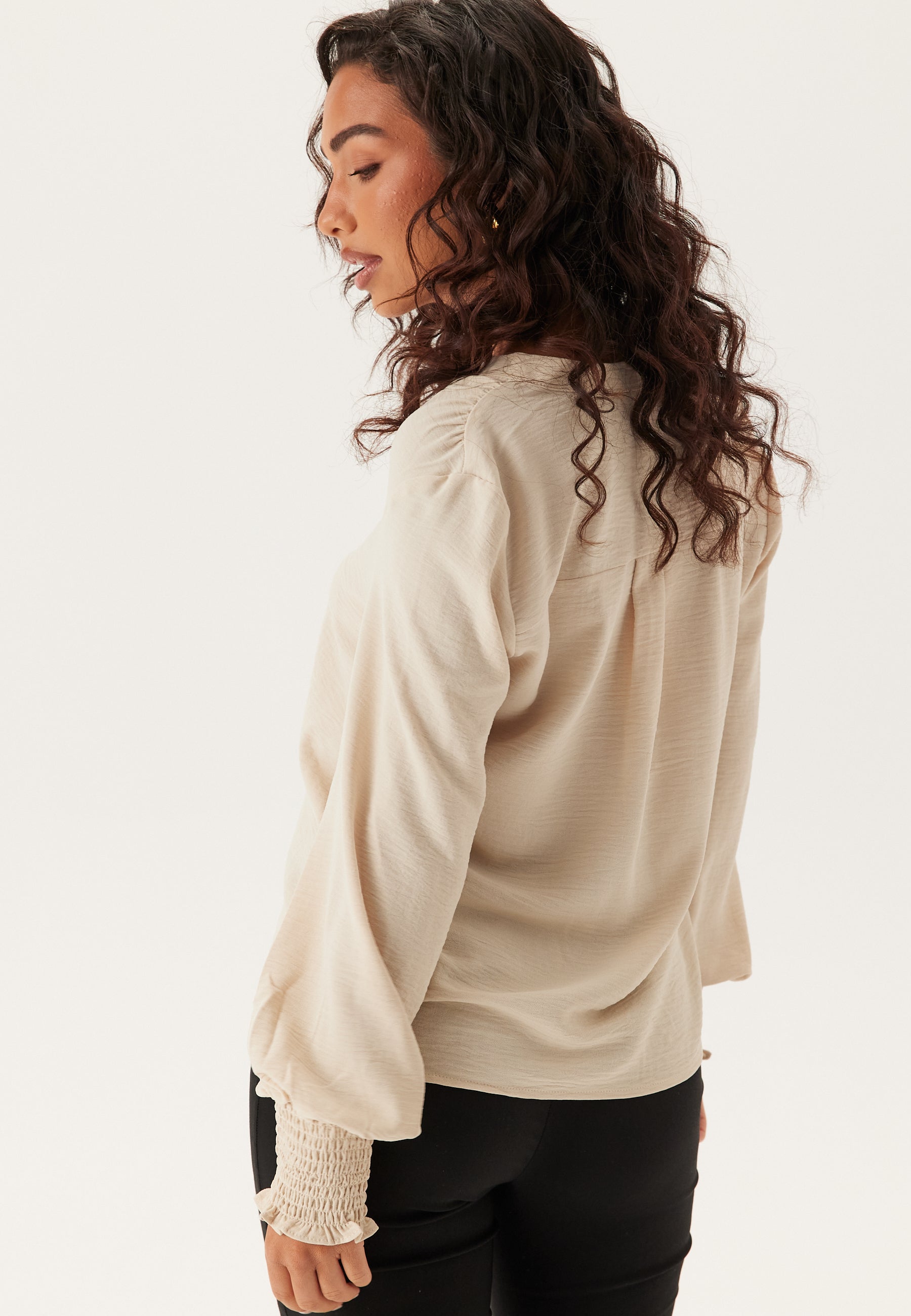 Denne langærmede bluse med V-hals er en nem hverdagsfavorit til arbejde, middagsaftaler og de dage, hvor du gerne vil se velklædt ud uden at føle dig for pyntet. Det bløde stof med let stræk gør den behagelig at have på, mens den rene udskæring og det enkle design gør den nem at style op med skræddersyede bukser eller holde afslappet med jeans.