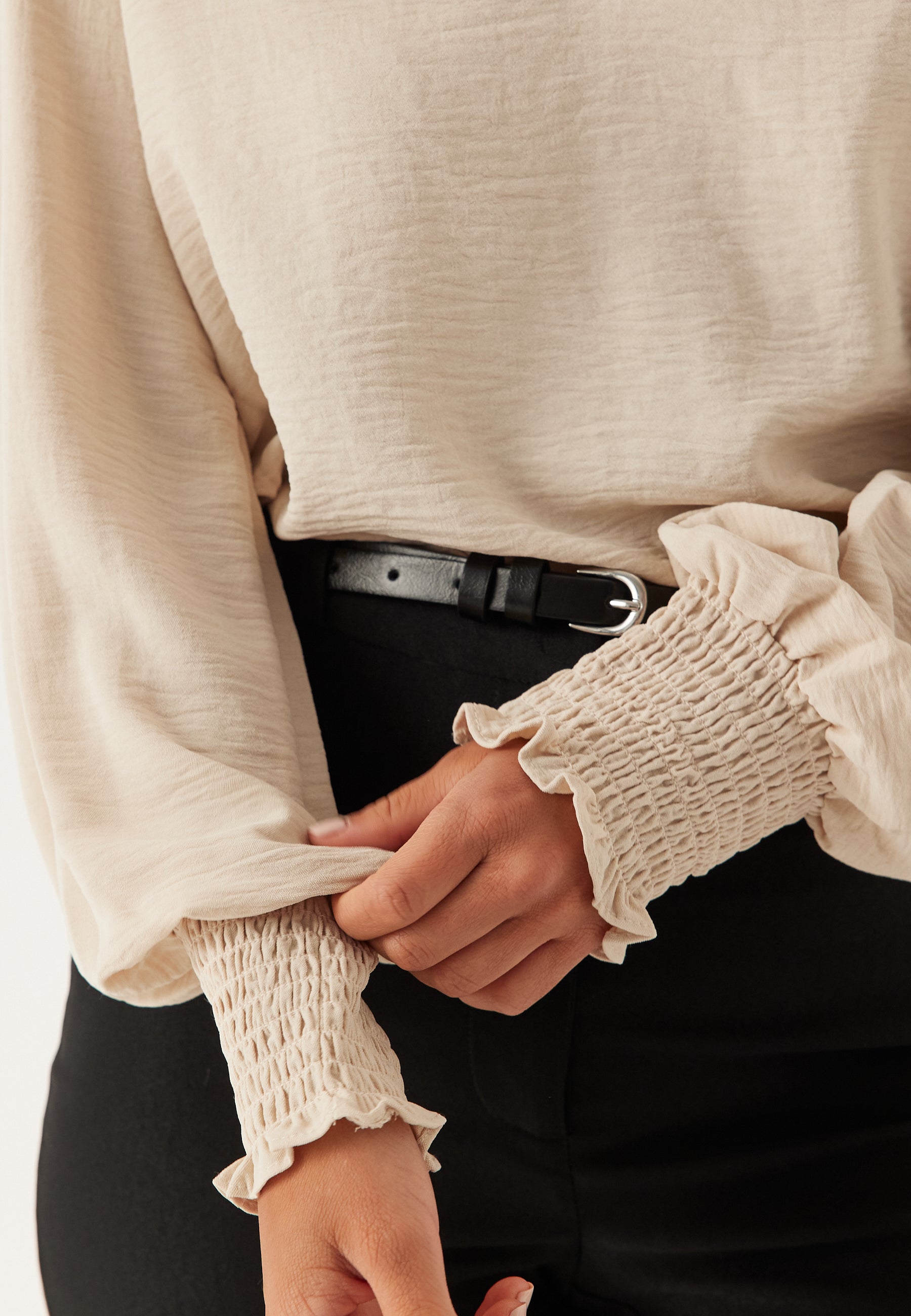 Det, der får den til at skille sig ud, er de smockede manchetter, som giver et diskret formet look og et mere gennemført udtryk end en helt enkel bluse. I den lyse grå Gray Morn-nuance, du ser her, føles den frisk og alsidig, med et afslappet fald, der fungerer godt både stukket ned i bukserne og båret løst.