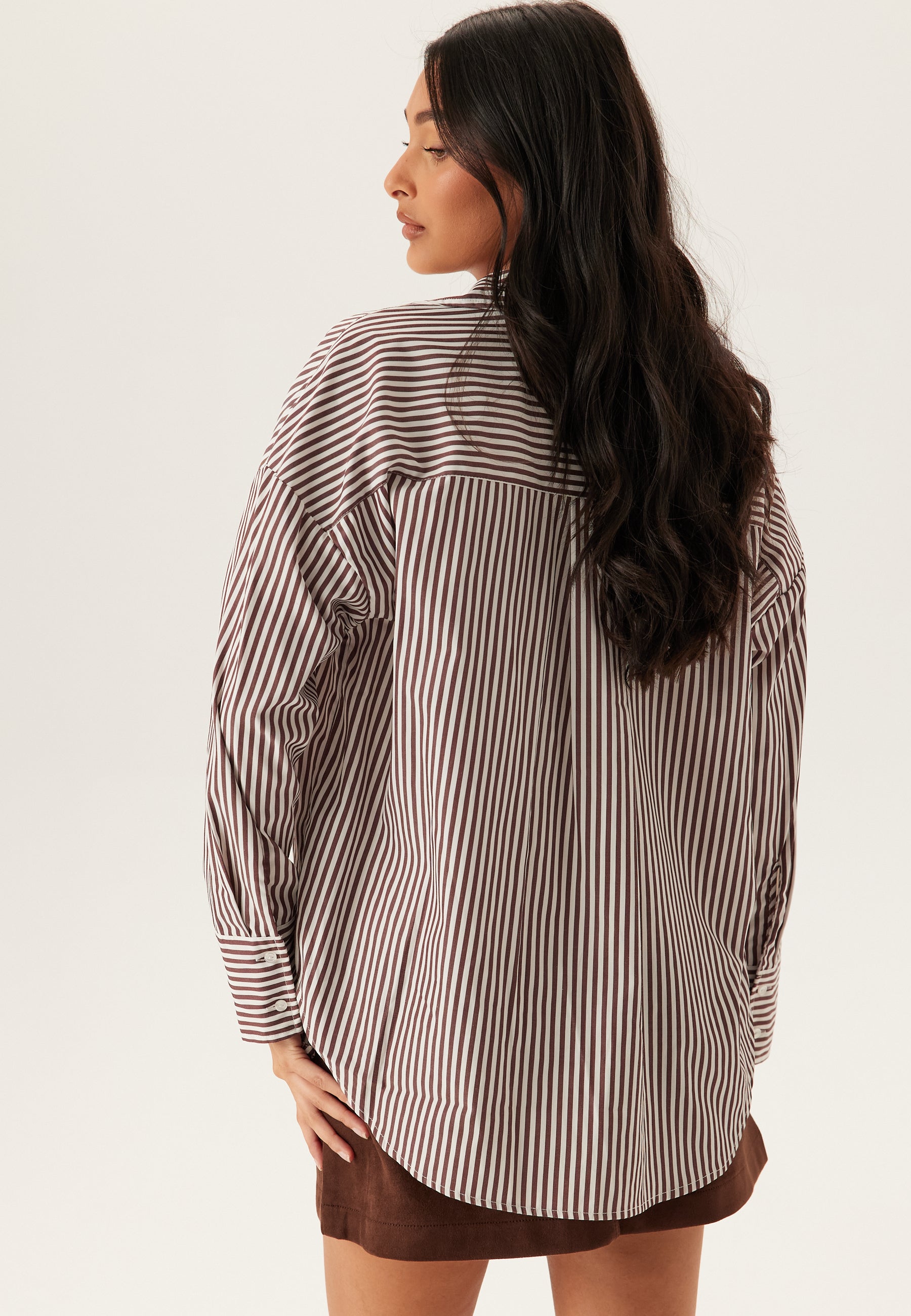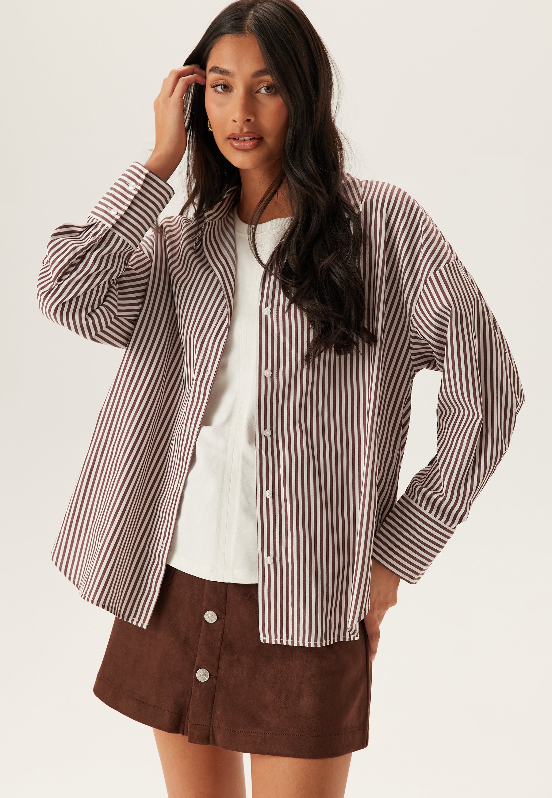 Denne stribede skjorte er en nem hverdagsfavorit med knapper – perfekt til arbejde, weekender og afslappede lag-på-lag looks. Den har en løs pasform og en sprød vævet kvalitet, som giver et rent, lidt borrowed-from-the-boys udtryk. De brune og hvide lodrette striber holder looket klassisk, mens den åbne V-udskæring med skjortekrave gør den lidt blødere og mere afslappet.
