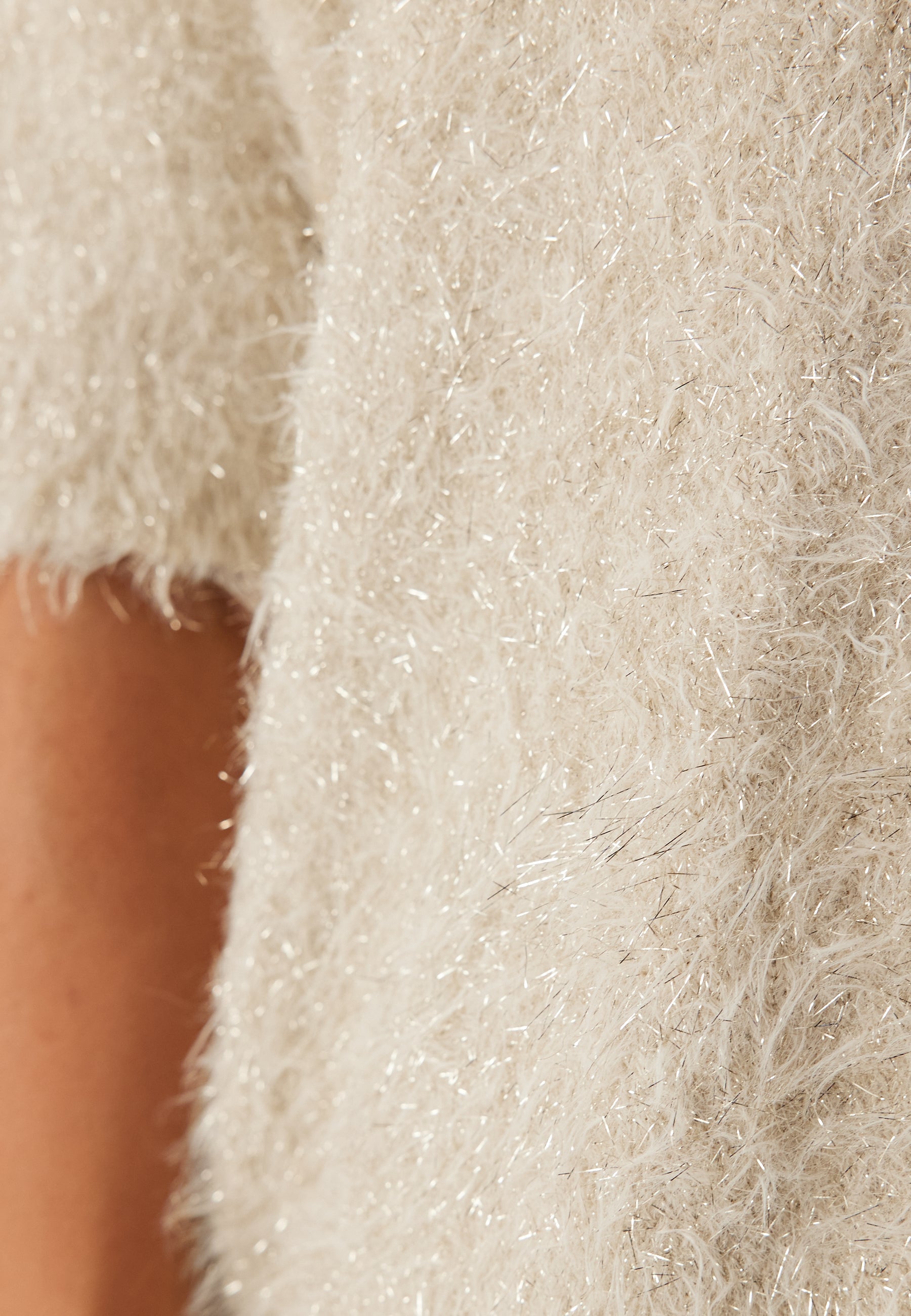 I en lys birch-nuance fungerer den perfekt som en neutral festtop, men er stadig nem at style til hverdag. Det lidt hyggelige look, de ribstrikkede manchetter og den enkle pasform gør den nem at bruge både stukket ned i underdelen eller løst, så du får komfort, glimmer og alsidighed samlet i én style.