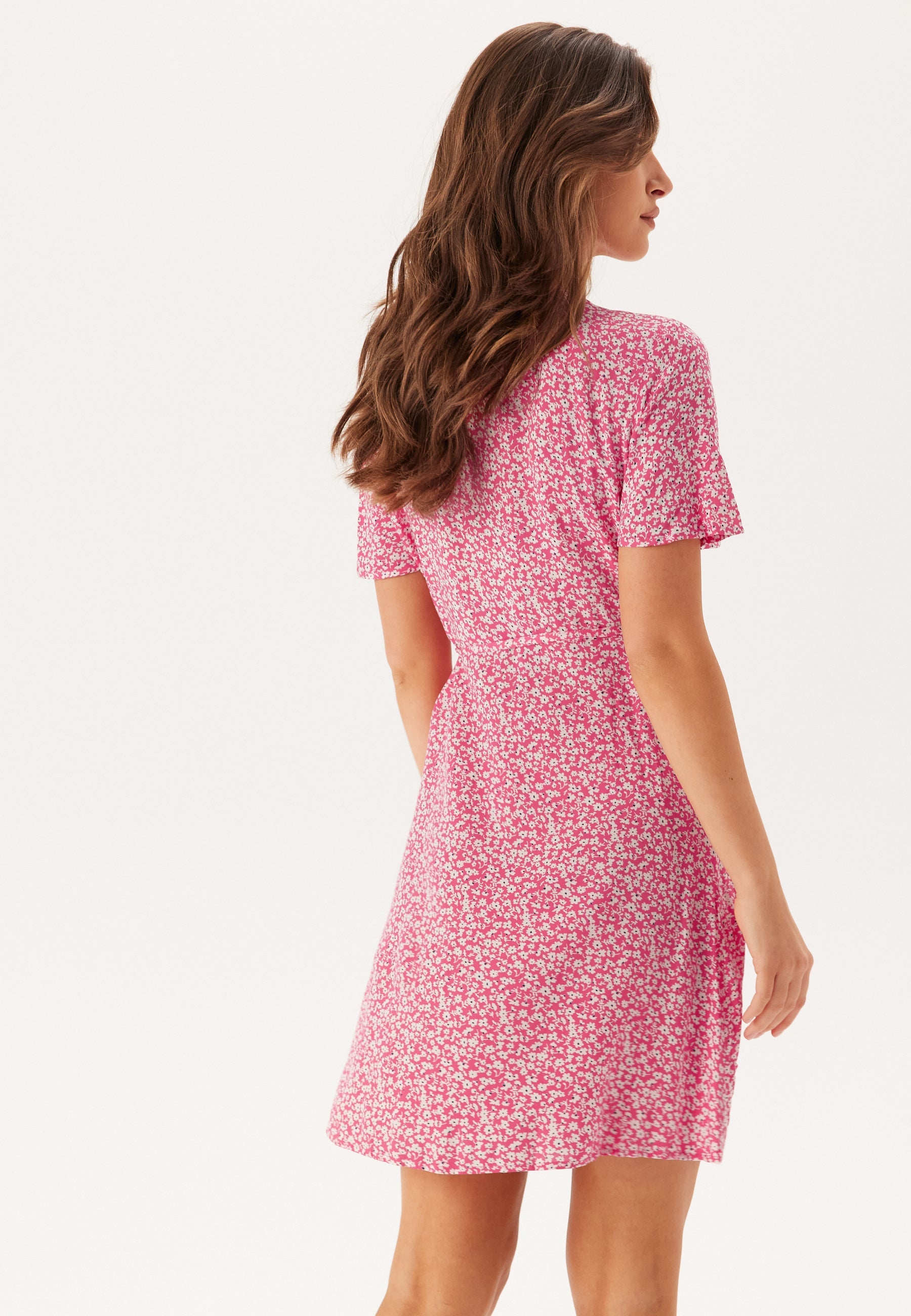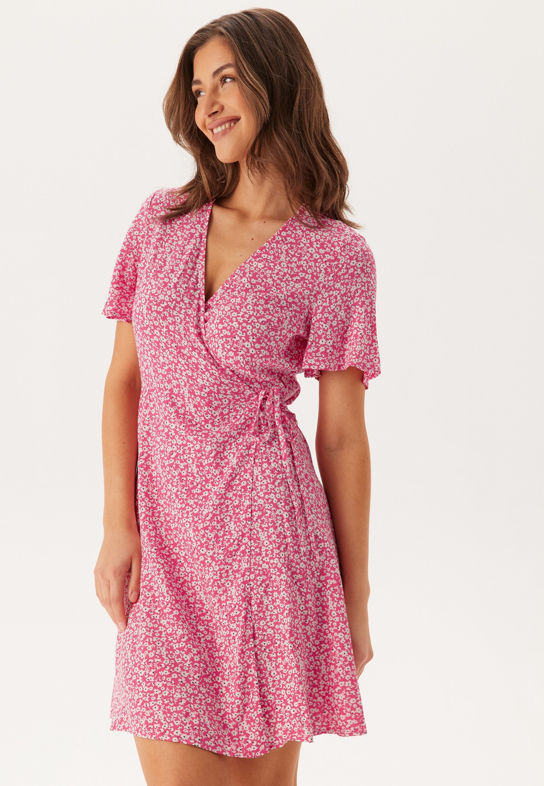 Denne lyserøde slå-om-kjole med blomsterprint er en nem sommerkjole i minilængde til hverdagsplaner, weekendfrokoster og ture i varmen. Slå-om-fronten og V-udskæringen giver den en naturligt flatterende pasform, mens det småblomstrede print over det hele holder looket friskt, feminint og nemt at style.