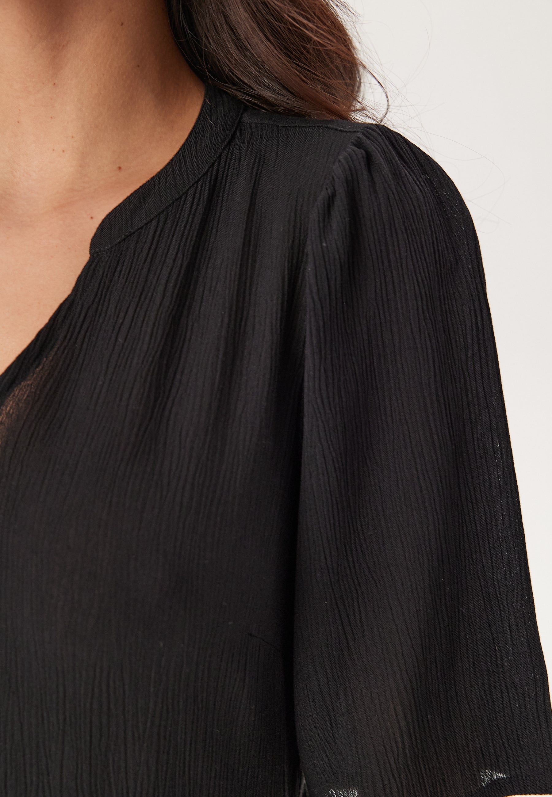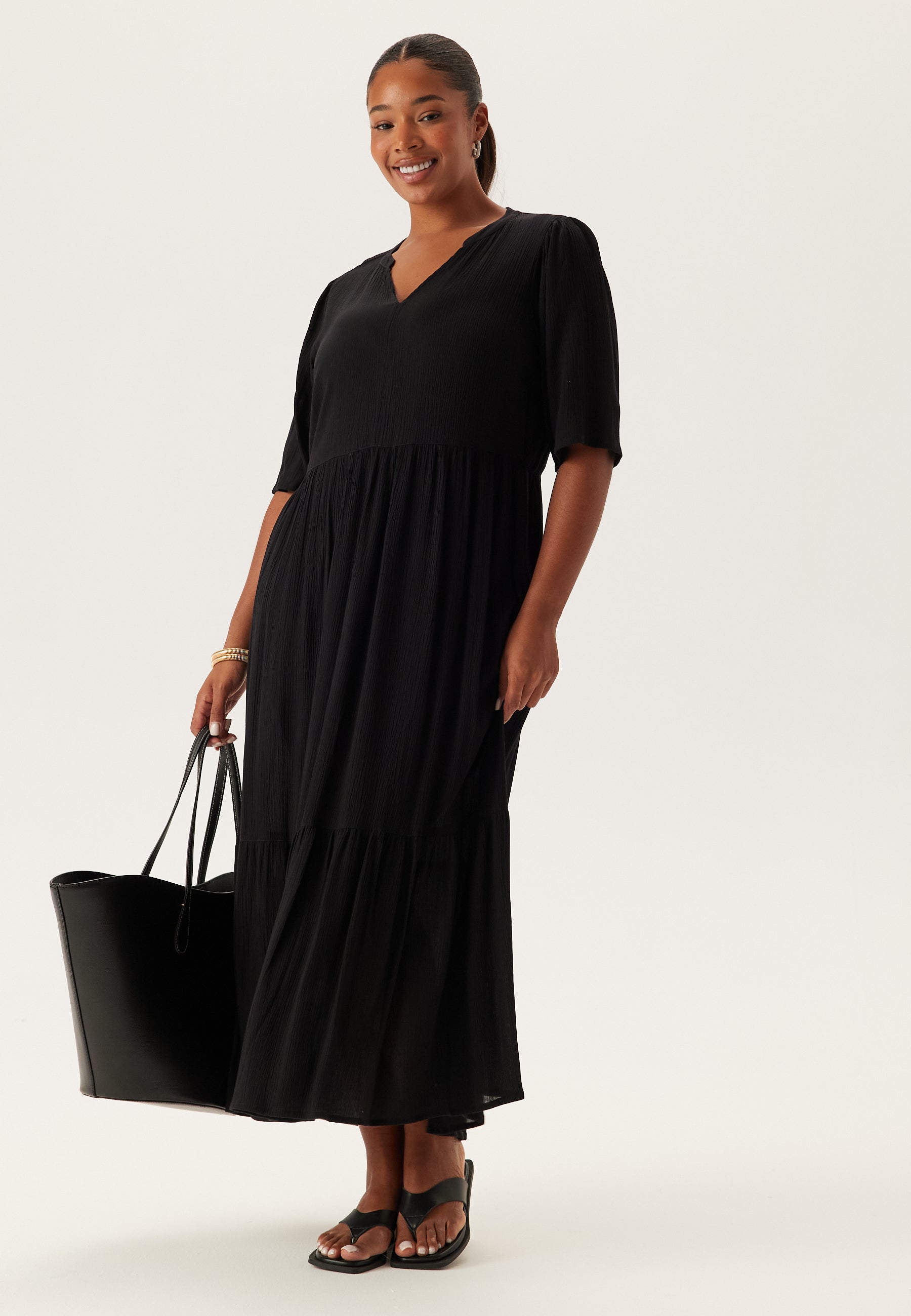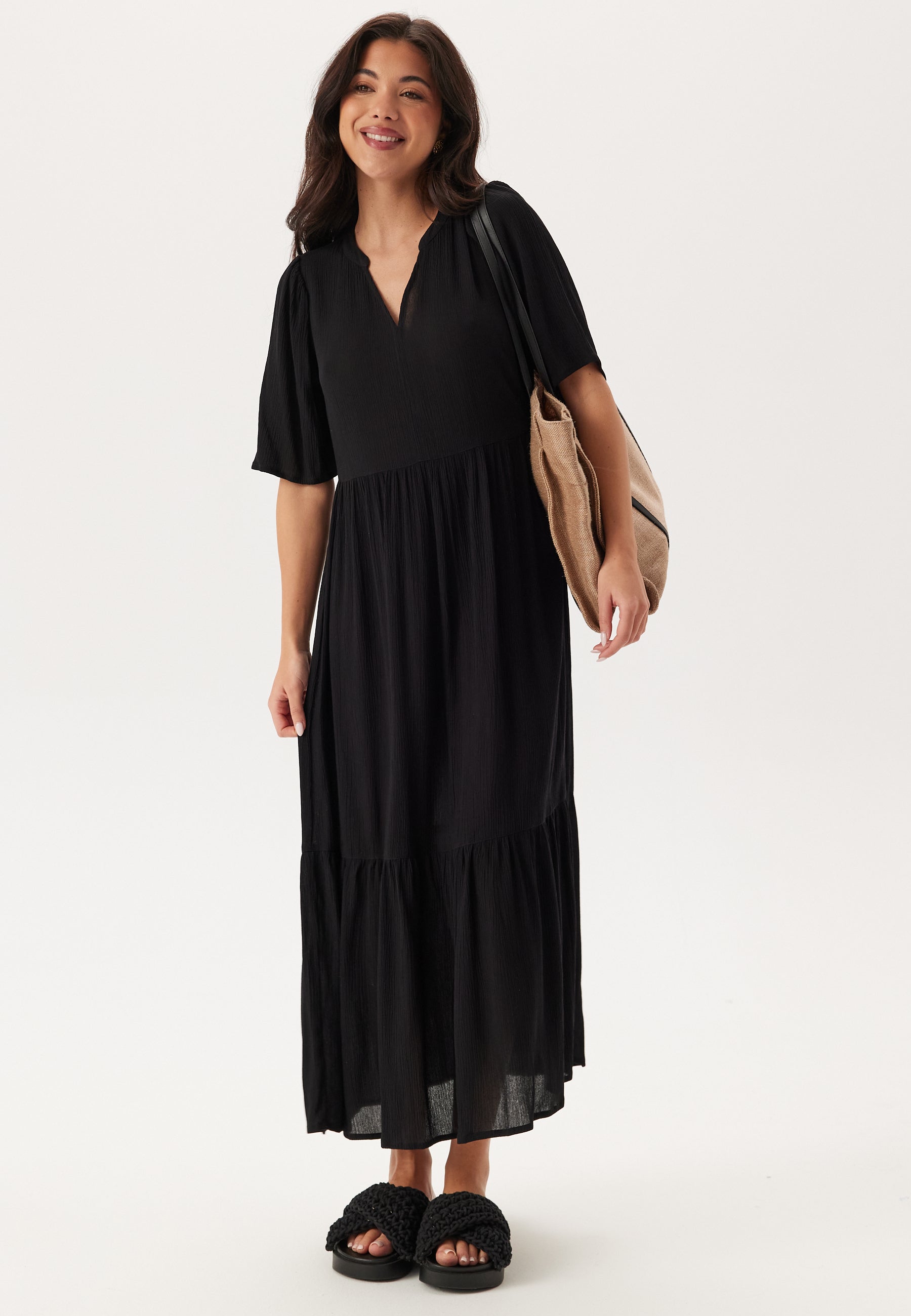 Denne sorte midikjole er en nem hverdagskjole til varme dage, afslappede middage og weekender, hvor du gerne vil være komfortabel uden at tænke for meget over det. Den er lavet i en vævet viskosekvalitet med let struktur og har et blødt fald, en afslappet pasform og pufærmer, som giver den lidt mere karakter end en helt enkel smid-over-kjole.