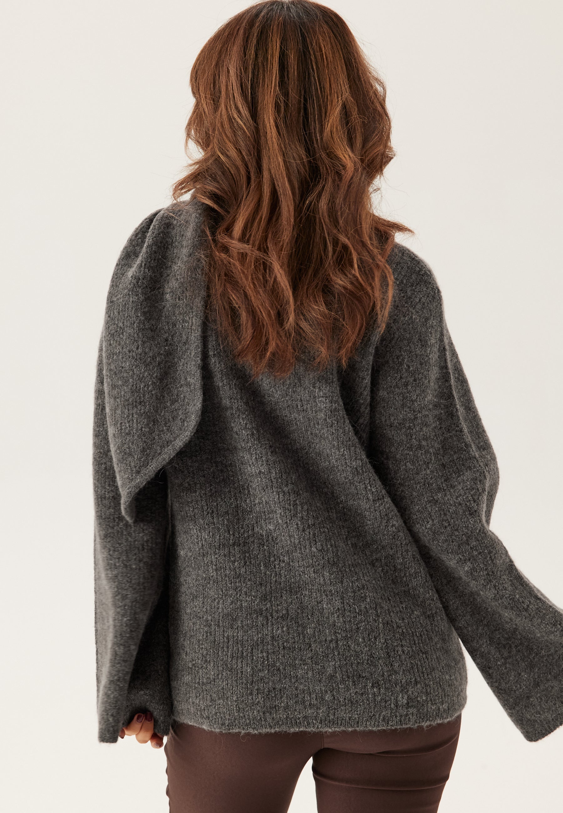 Den afslappede facon og de brede ærmer skaber en ren, let draperet silhuet, som føles rummelig og behagelig, men stadig ser velklædt ud. Detaljen med bindebånd ved halsen skiller sig ud på den helt rigtige måde, giver en tørklædelignende finish ved kraven og får denne pullover til at føles lidt mere særlig end din sædvanlige strik.