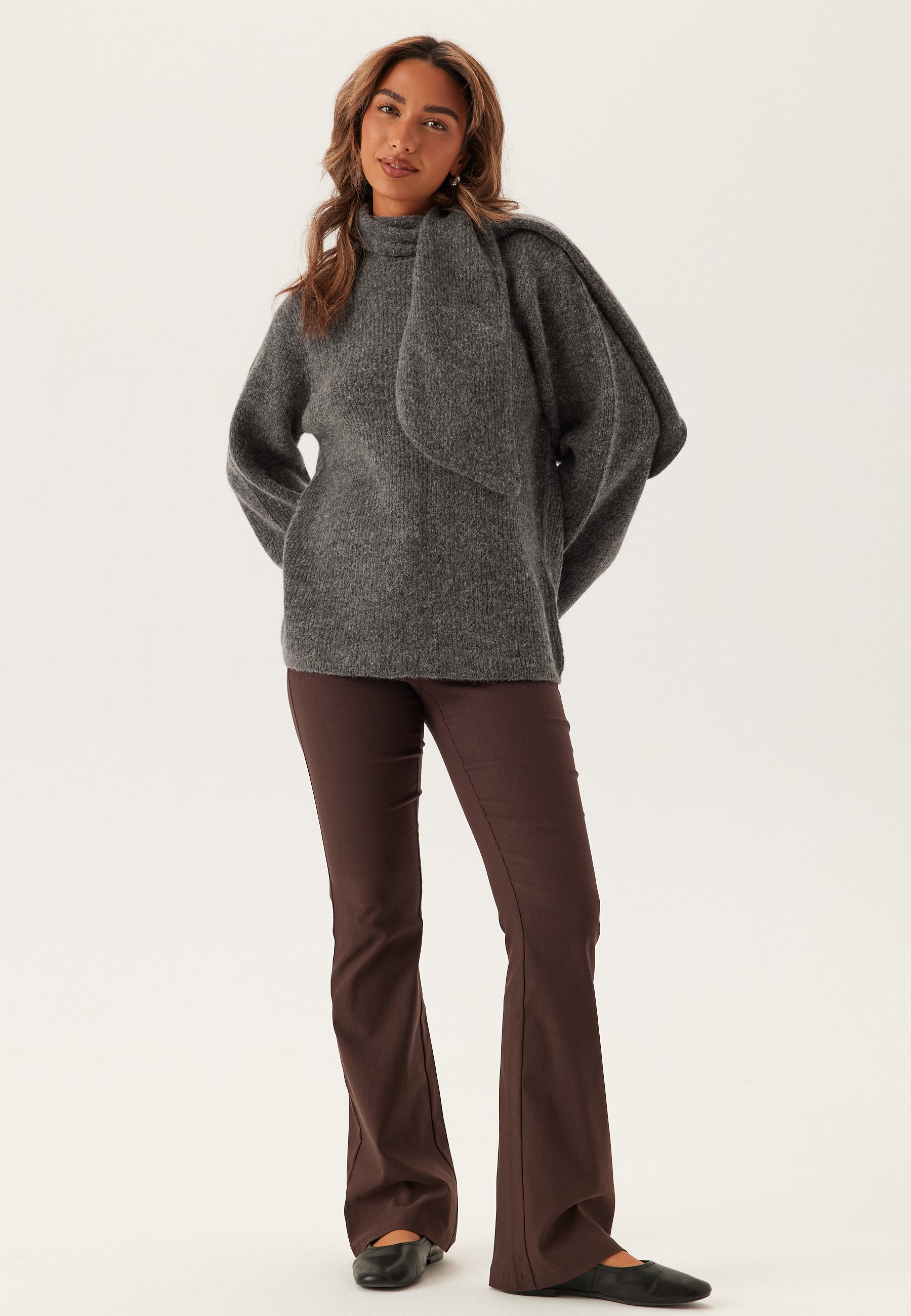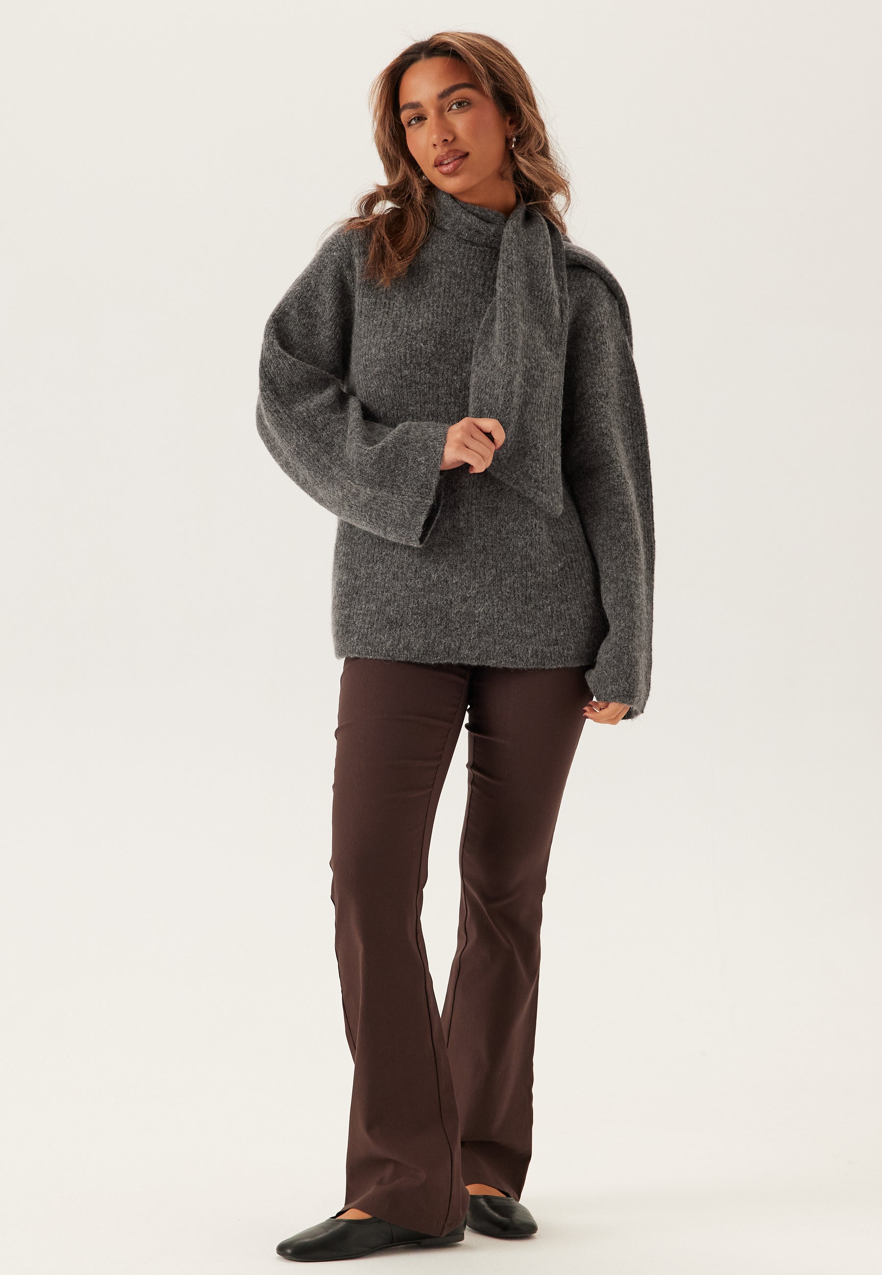 Denne grå striktrøje er et nemt lag til hverdagen med en blød, strækbar følelse, en løs pasform og en høj krave med bindebånd, der giver den et mere stylet udtryk end en almindelig strik. Det er den slags strik, du griber efter på arbejdsdage, i weekenden og til middage i køligt vejr, når du gerne vil være komfortabel uden at se for afslappet ud.