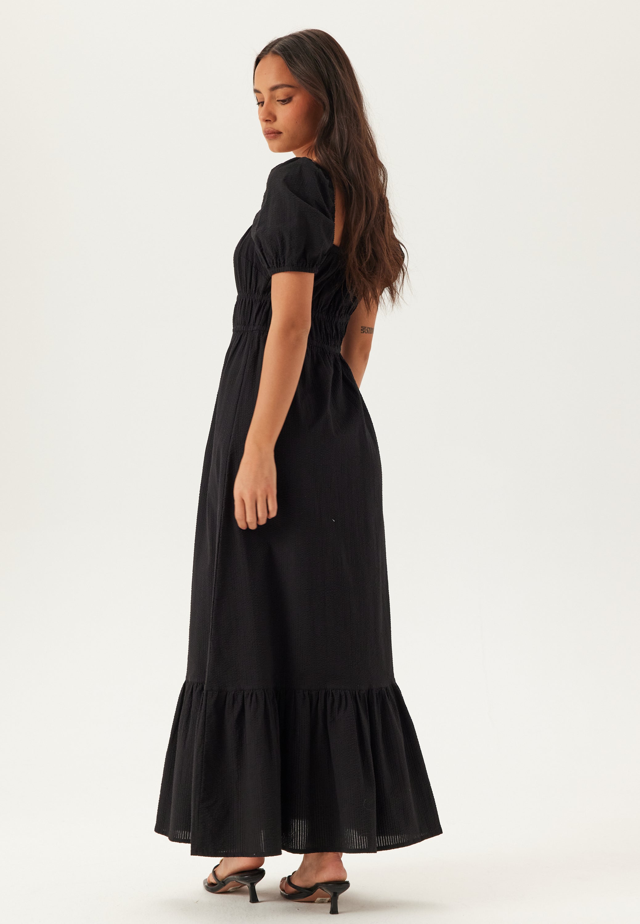 Brug den med flade sandaler om dagen, eller style den med sandaletter og enkle smykker til middag eller en ferieklar aften ude. Det er den slags lange sorte kjole, der er nem at style, nem at have på og et sikkert valg, når du gerne vil have komfort, form og lidt ekstra struktur i ét og samme look.