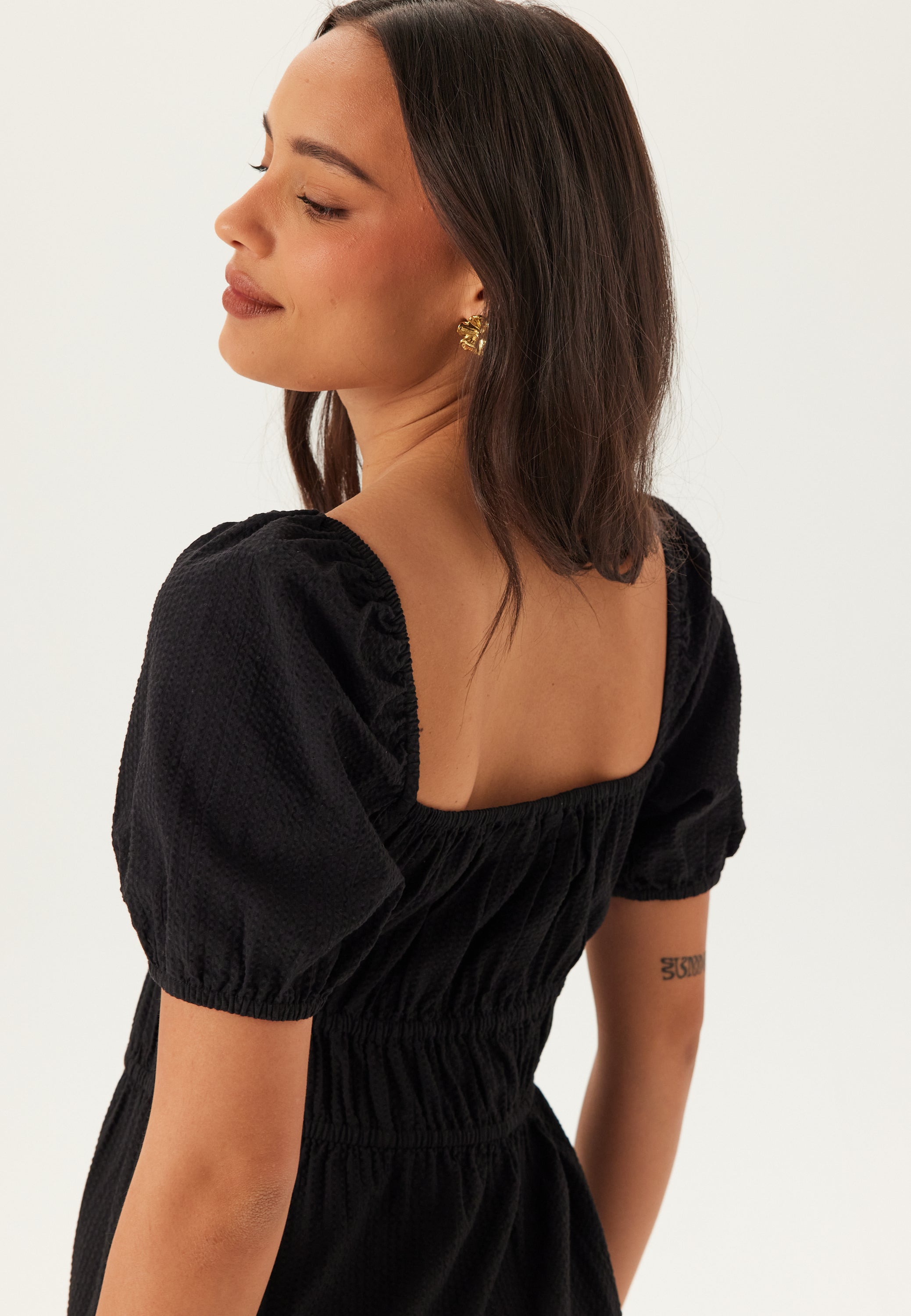 - Ærmer: Korte pufærmer med elastiske manchetter