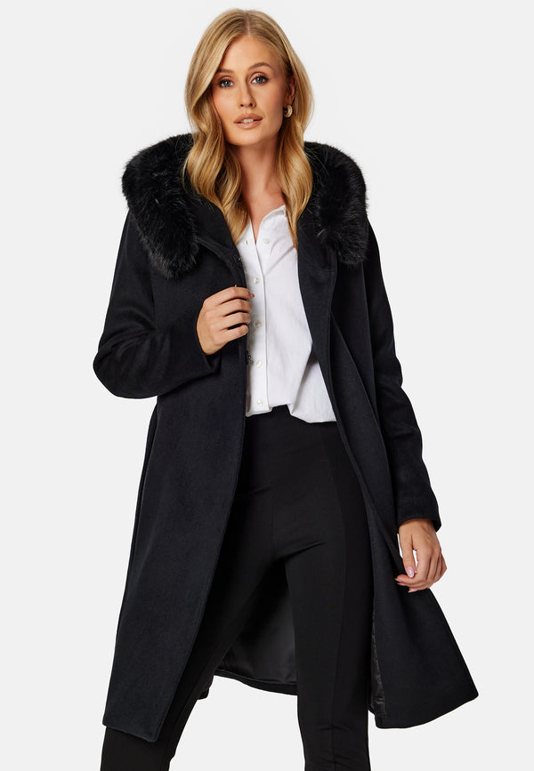Elegant frakke fra ROCKANDBLUE med bindebånd og kunstig pels.