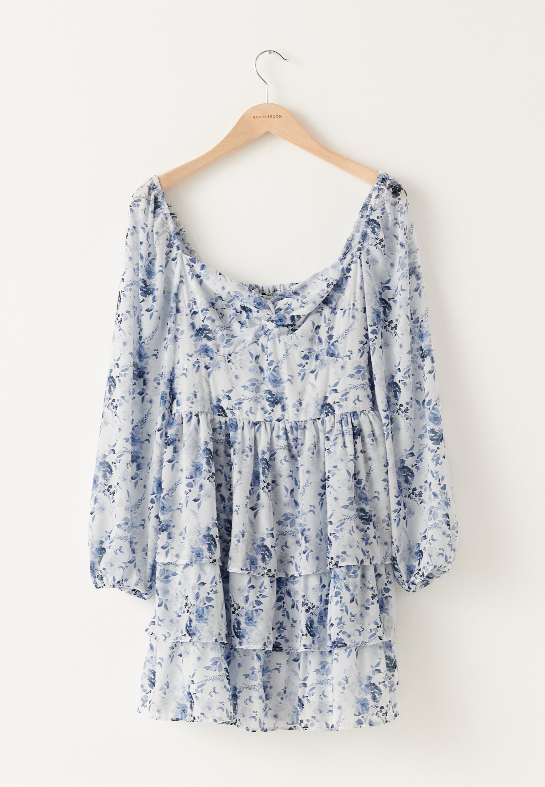 Det bløde blå blomsterprint giver den et friskt og romantisk udtryk, som gør den til et skønt valg til alt fra havefester til weekendfejringer. Det er den slags minikjole med lange ærmer, der føles særlig med det samme, men stadig er nem at have på takket være det lette stof, den behagelige smock bagpå og den flatterende form.