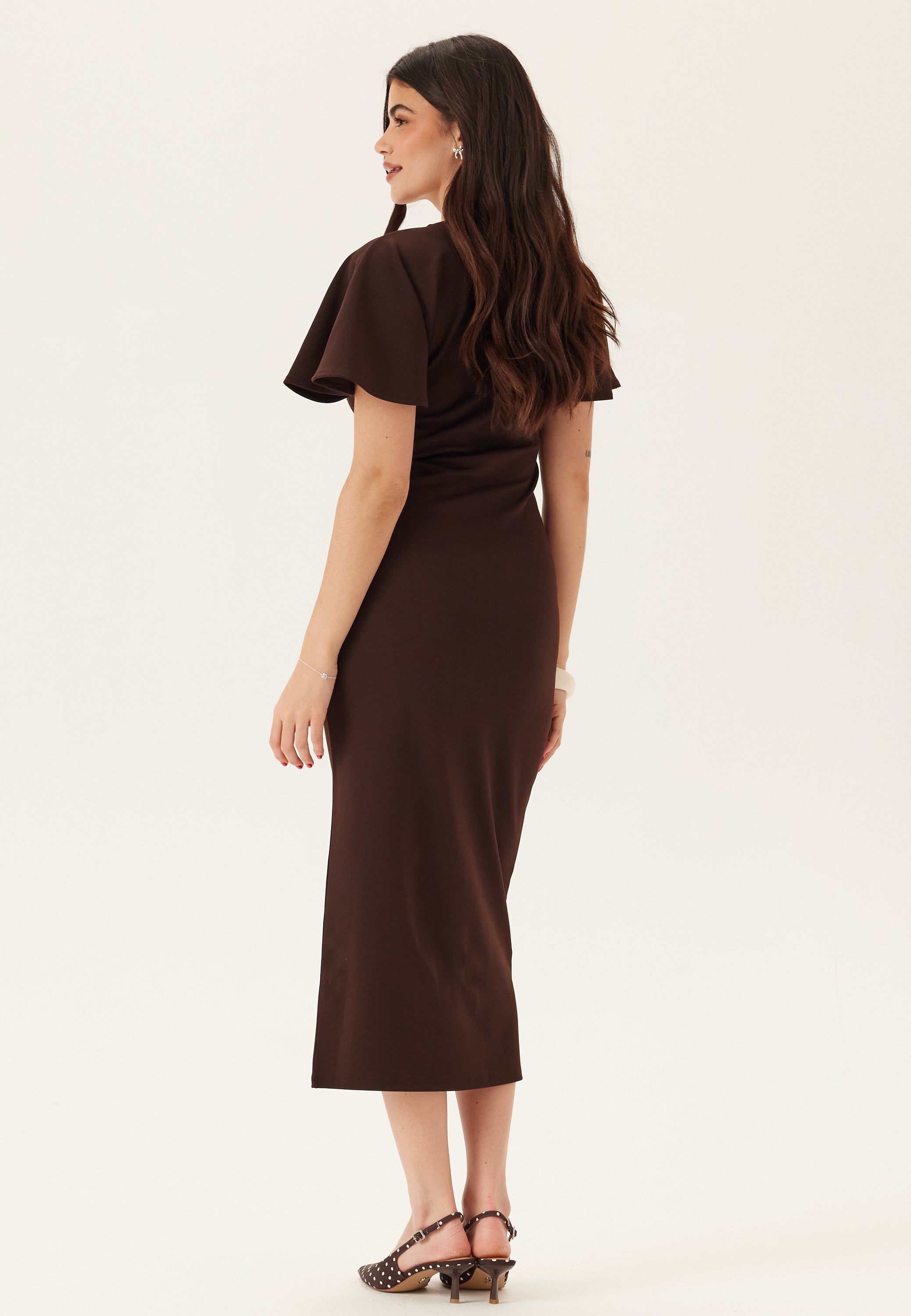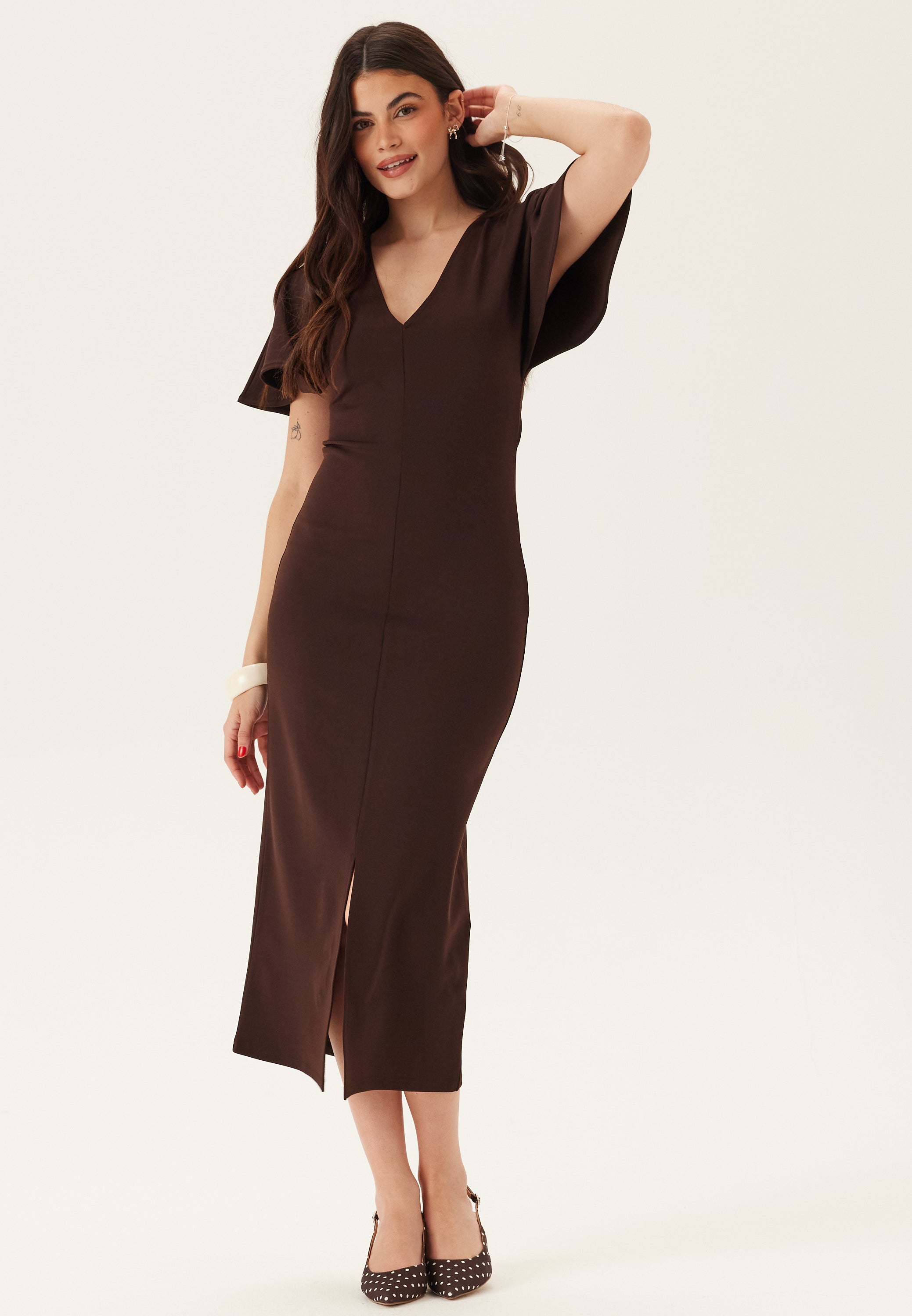 Denne brune midikjole er en tætsiddende festkjole i jersey med V-udskæring og bløde sommerfugleærmer – perfekt til middage, events og aftener, hvor du gerne vil være velklædt, men stadig føle dig godt tilpas. Det strækbare trikotstof smyger sig om kroppen uden at føles stift, og den dybe brune farve giver et mere moderne og gennemført look end den klassiske sorte kjole.
