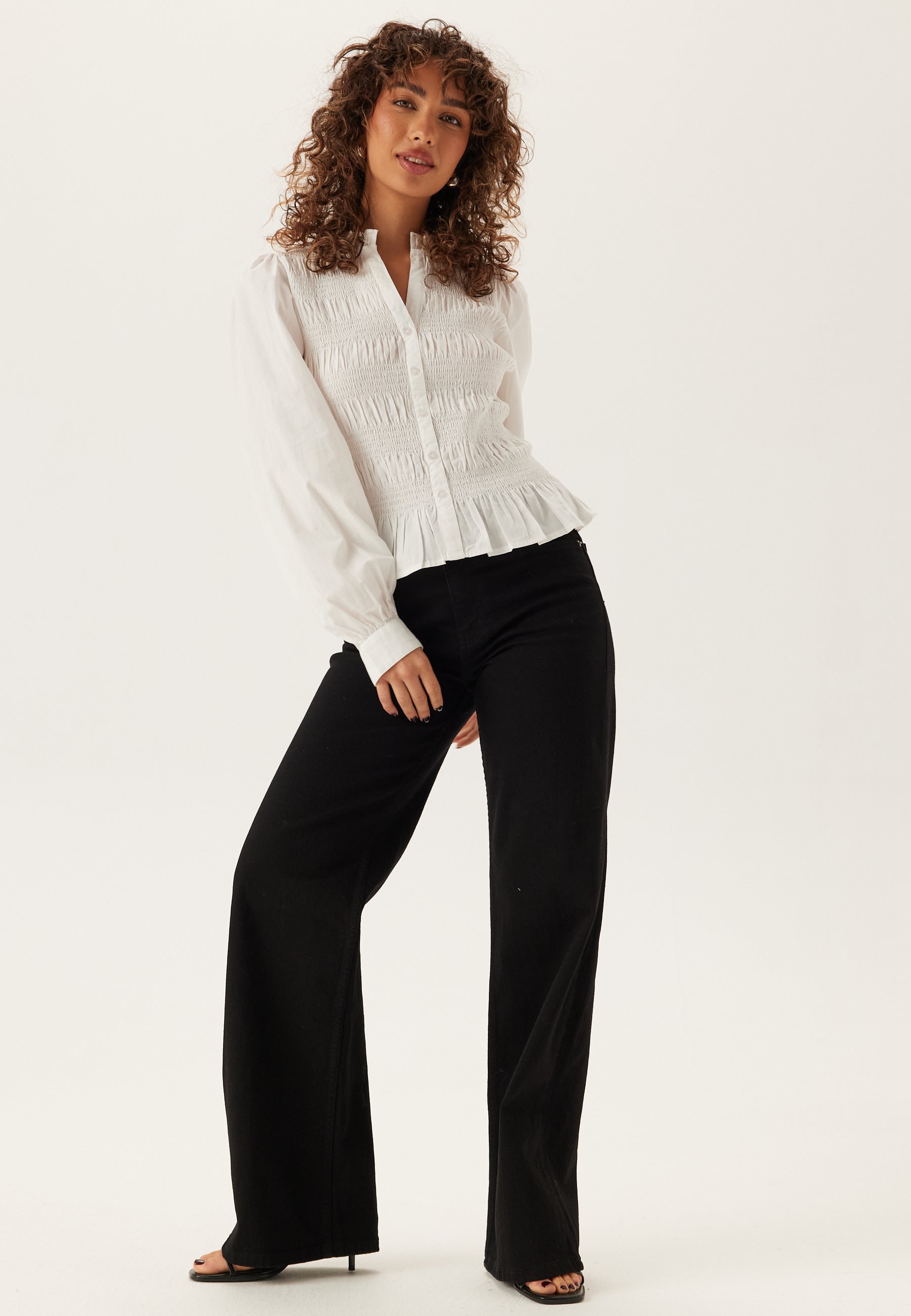 Pufærmer med manchetter giver den den flotte, afbalancerede form, mange leder efter i en langærmet bluse, og de dekorative knapper foran holder udtrykket enkelt og let romantisk. Bomuldsstoffet gør den åndbar og behagelig at have på, mens den rynkede struktur får den til at skille sig ud fra en helt enkel hvid bluse.