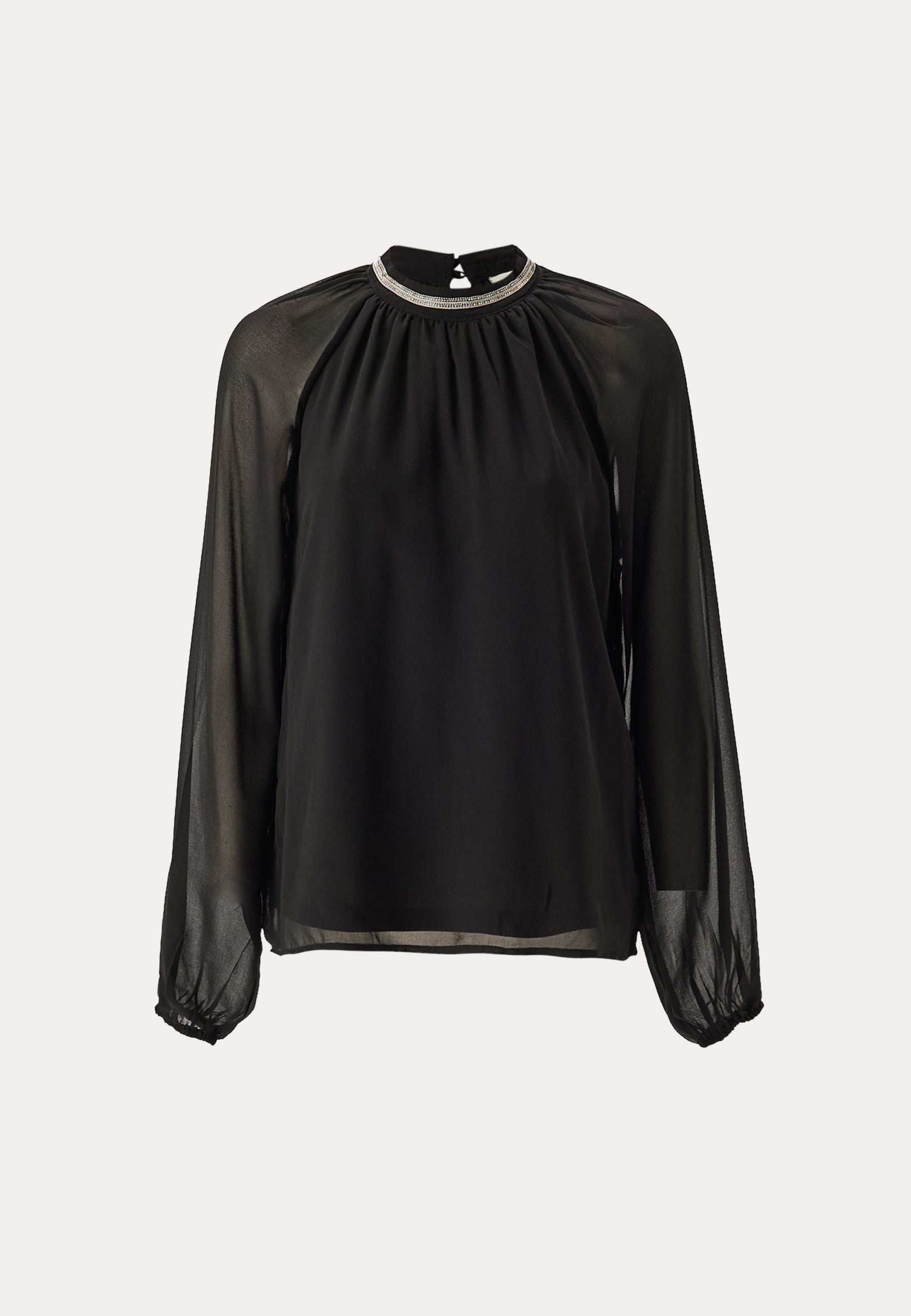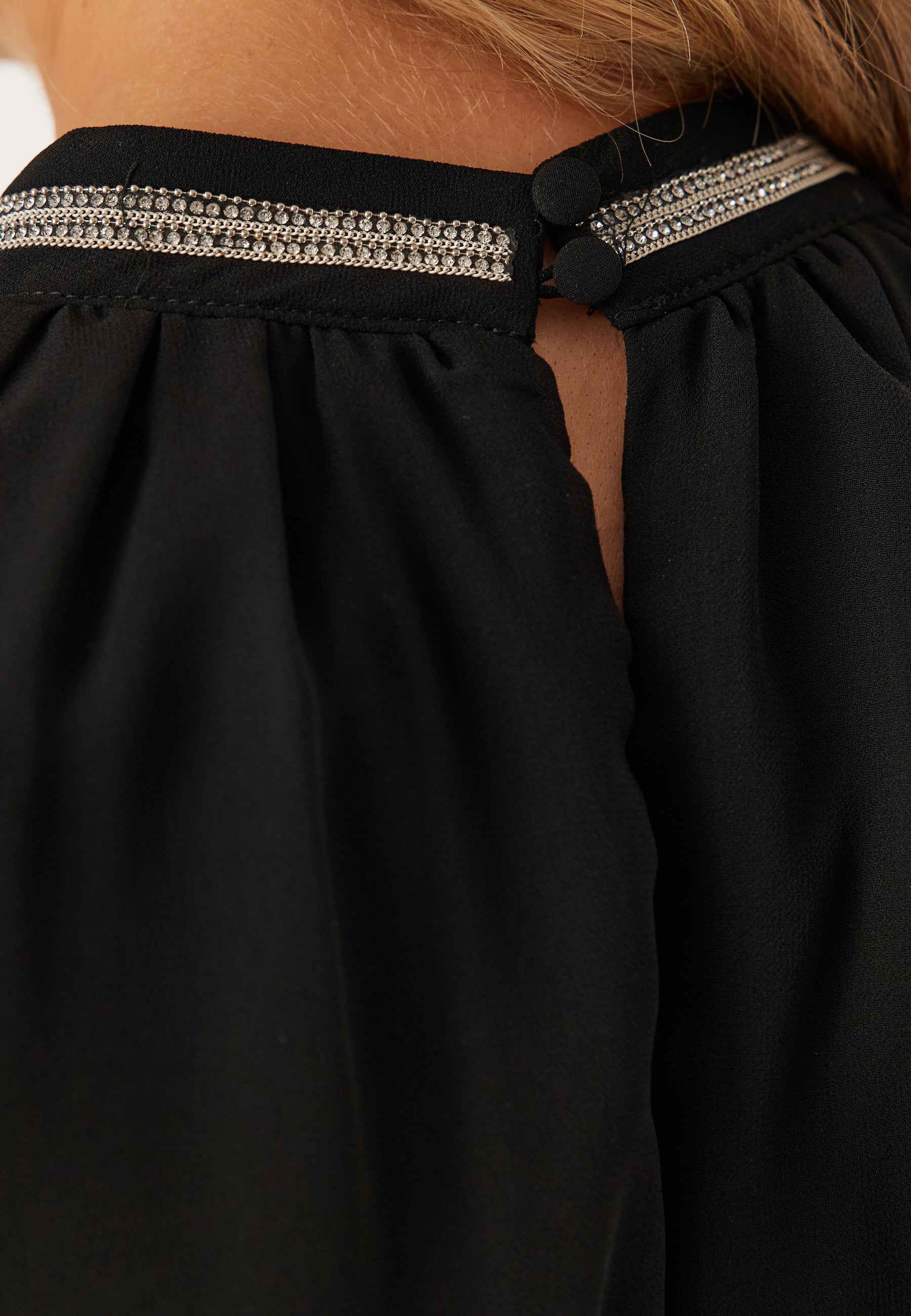 - Noget højere halsudskæring med rhinstensudsmykning
