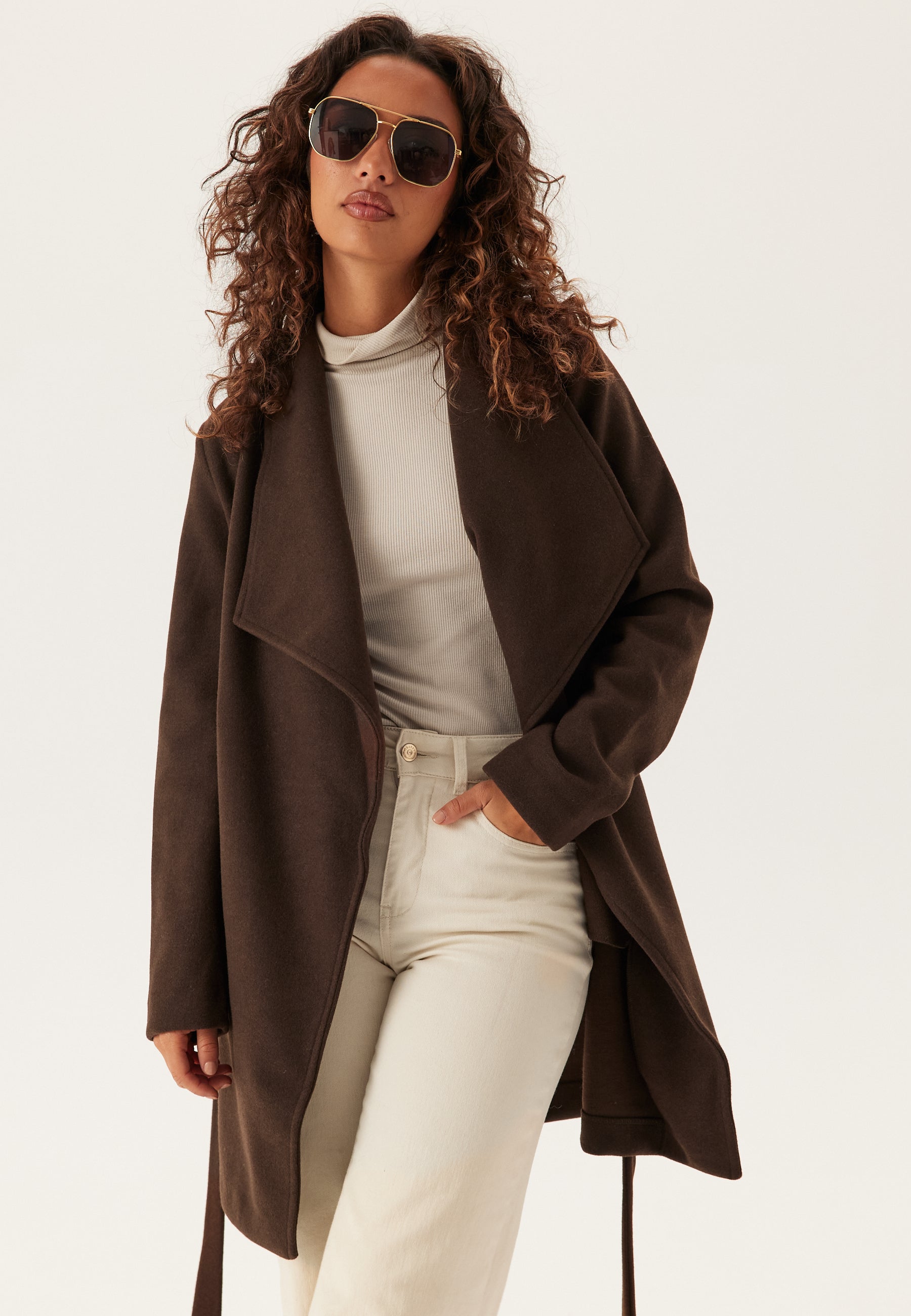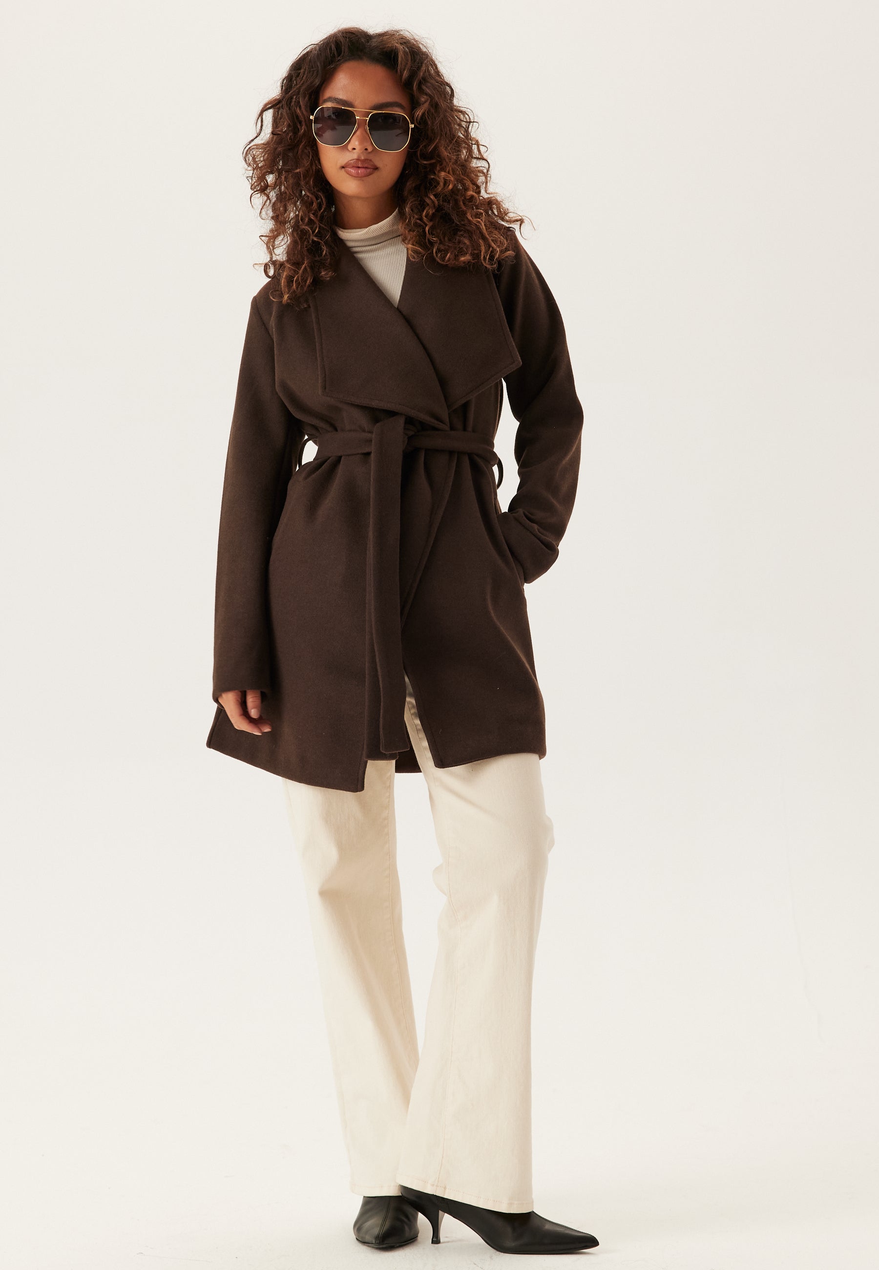 Denne slå-om-frakke med bindebælte i en dyb kaffebrun nuance er et nemt lag til efterårs- og forårsdage, hvor du gerne vil have lidt varme uden at føle dig pakket ind. Sjalskraven giver et blødere og mere afslappet udtryk end en klassisk skræddersyet frakke, og bindebæltet i taljen gør, at du kan bruge den åben og løs eller binde den ind for en mere markeret silhuet.
