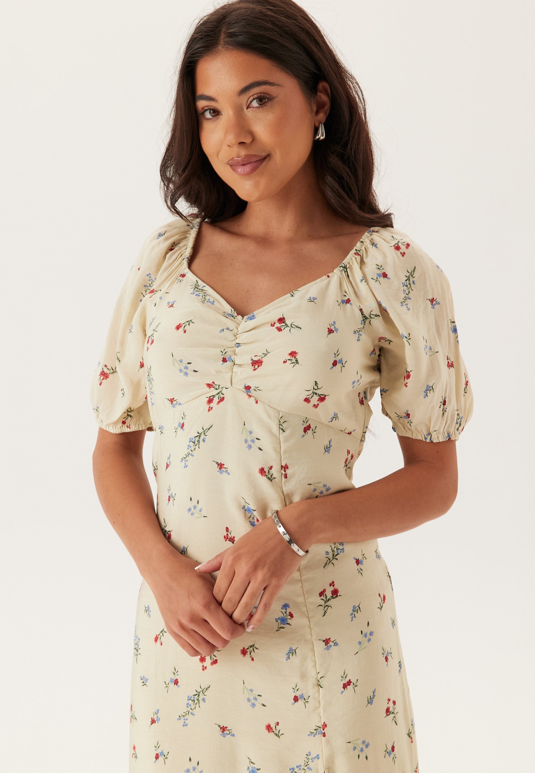 Pasformen er let figursyet over overdelen, og den skjulte lynlås i siden giver en pæn finish. De korte pufærmer med elastik ved kanten og elastik ved skuldrene giver blød volumen og får udskæringen til at sidde behageligt, mens midilængden gør den nem at style med sandaler om dagen eller lave hæle om aftenen.