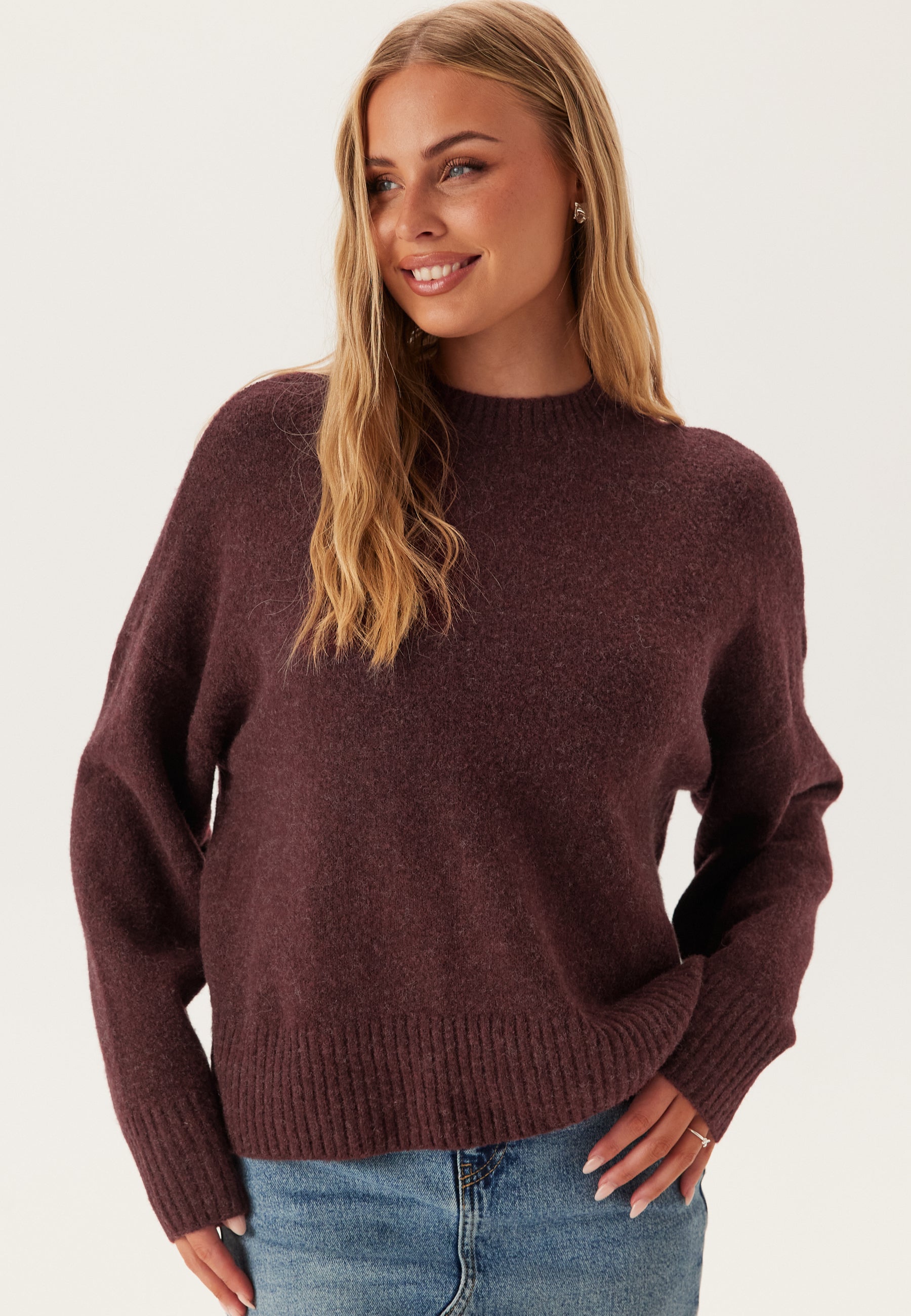 Denne bordeauxstrikkede sweater er et nemt hverdagslag til arbejde, weekender og kølige aftener, når du gerne vil have noget blødt på uden at føle dig pakket ind. Den runde halsudskæring og den afslappede pasform giver et roligt look, som stadig er pænt nok til at bruge stukket ned i jeans, habitbukser eller en midinederdel.