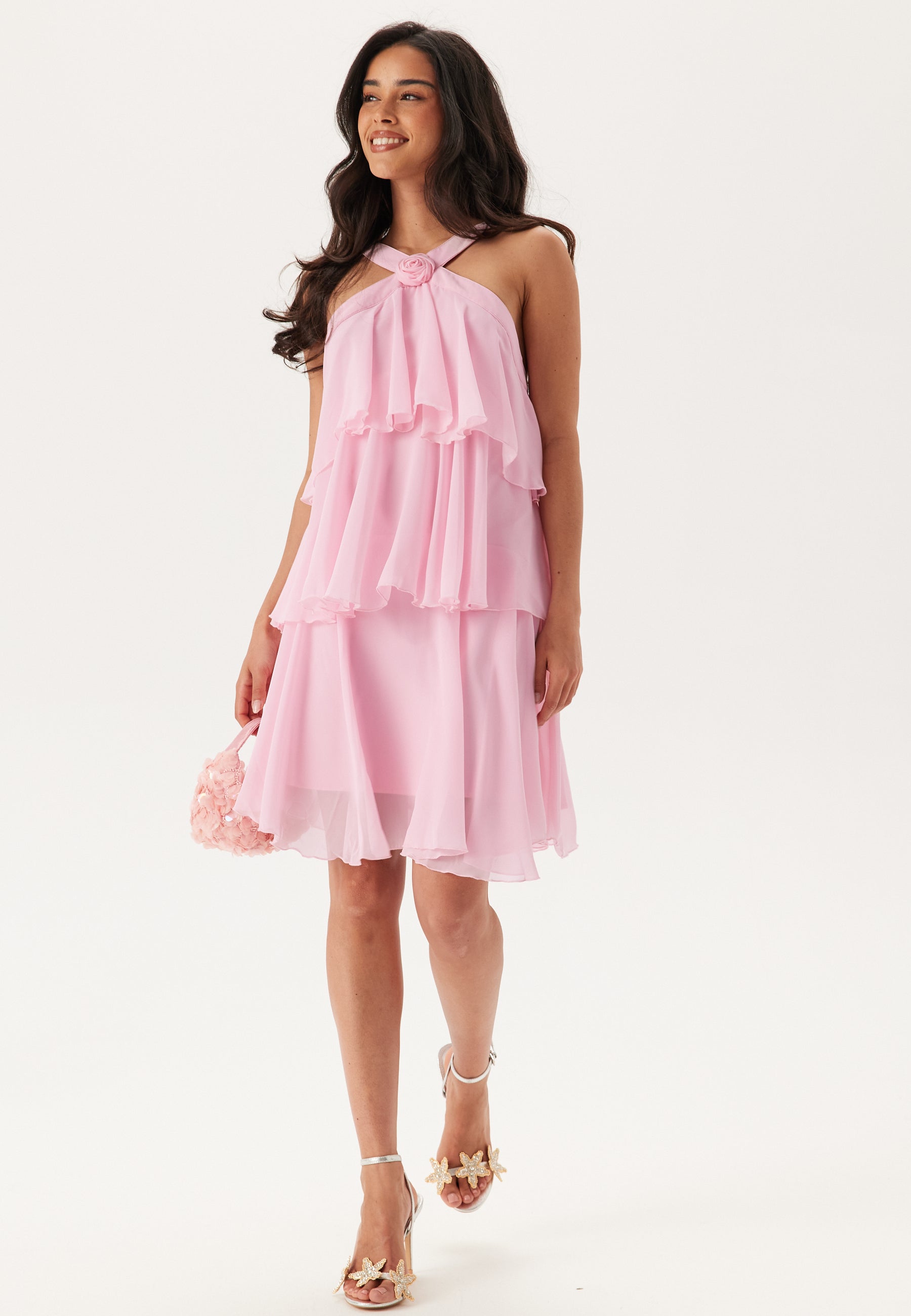 Denne lyserøde halterneck-minikjole er perfekt til bryllupsgæster, brudepiger og sommerfester, når du vil have noget let, fint og nemt at have på. Det bløde, vævede stof uden stretch giver et luftigt fald, mens blomsterdetaljen ved halsudskæringen og det lagdelte flæsedesign skaber flot bevægelse uden at virke for meget.