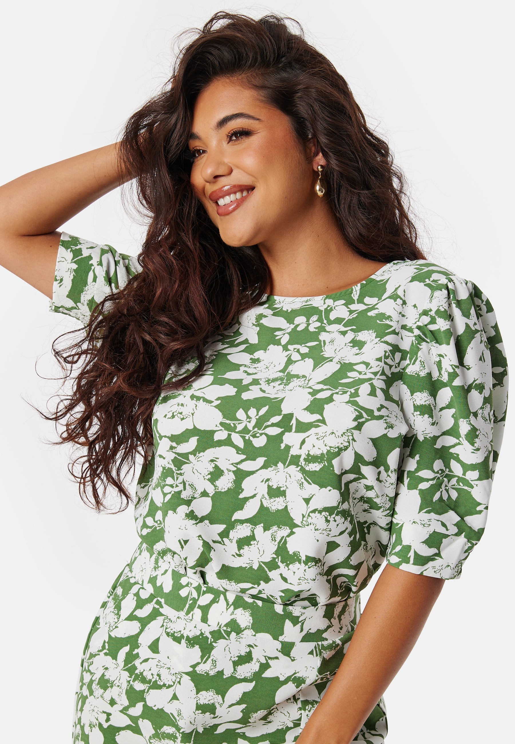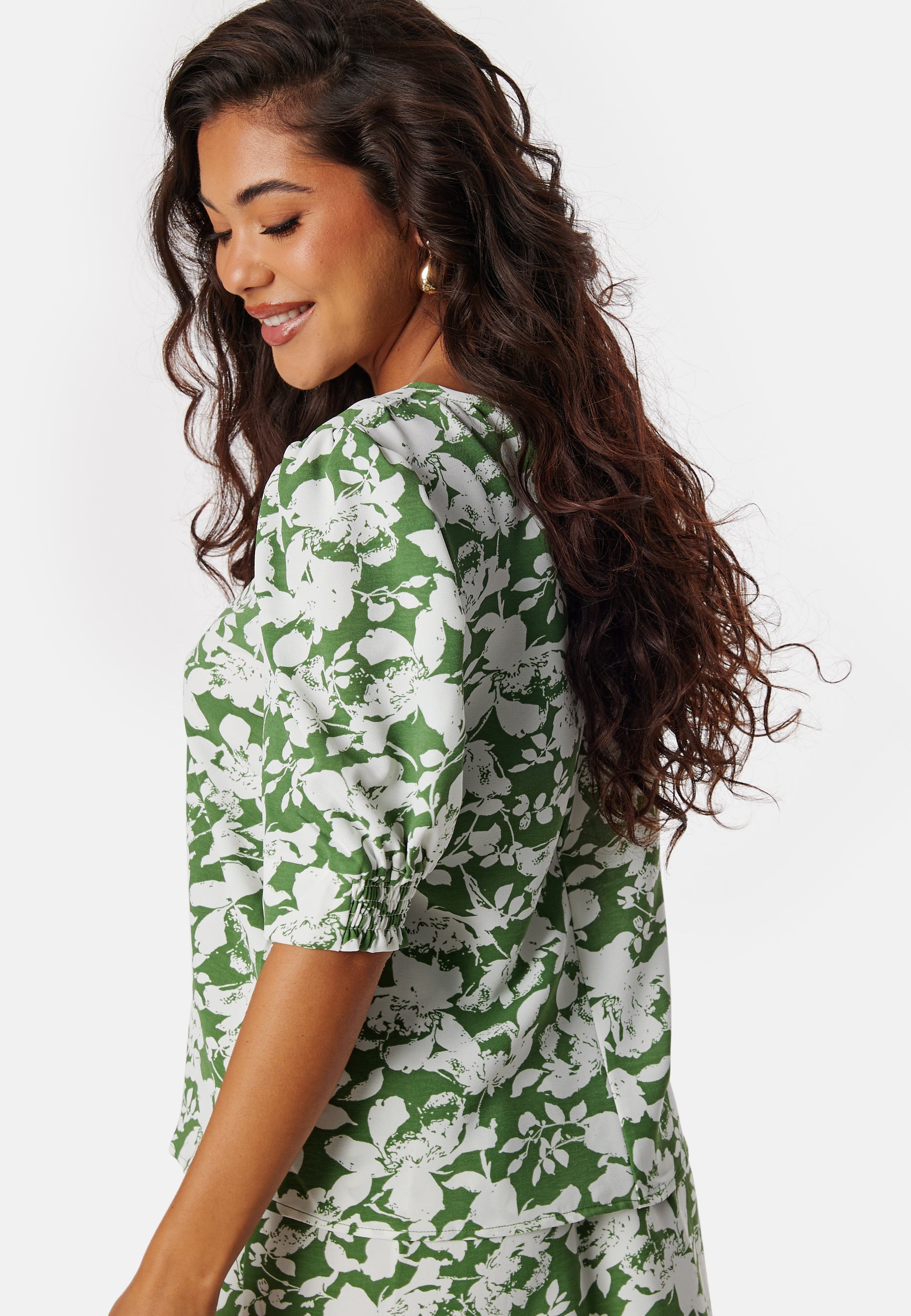 - Kort pufærmer med elastik på ærmeafslutningerne.