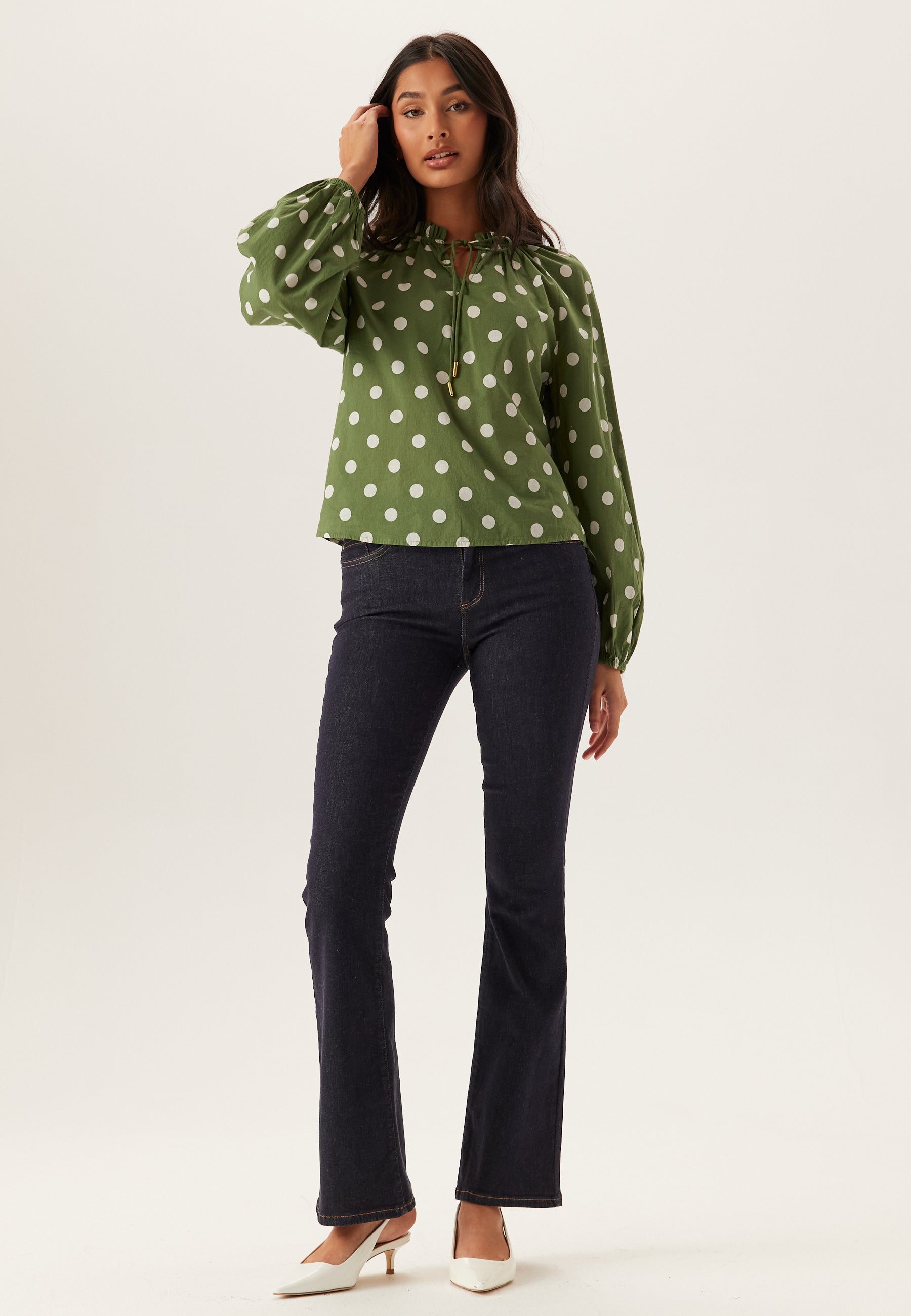 Denne langærmede bluse er en nem hverdagsfavorit til arbejde, middag eller weekender, hvor du gerne vil have noget let, klædeligt og lidt mere velklædt end en helt enkel skjorte. Det vævede materiale uden stræk giver et flot fald, mens det grønne prikkede print tilfører et friskt og legende udtryk, som passer rigtig godt til mørke jeans eller skræddersyede bukser.