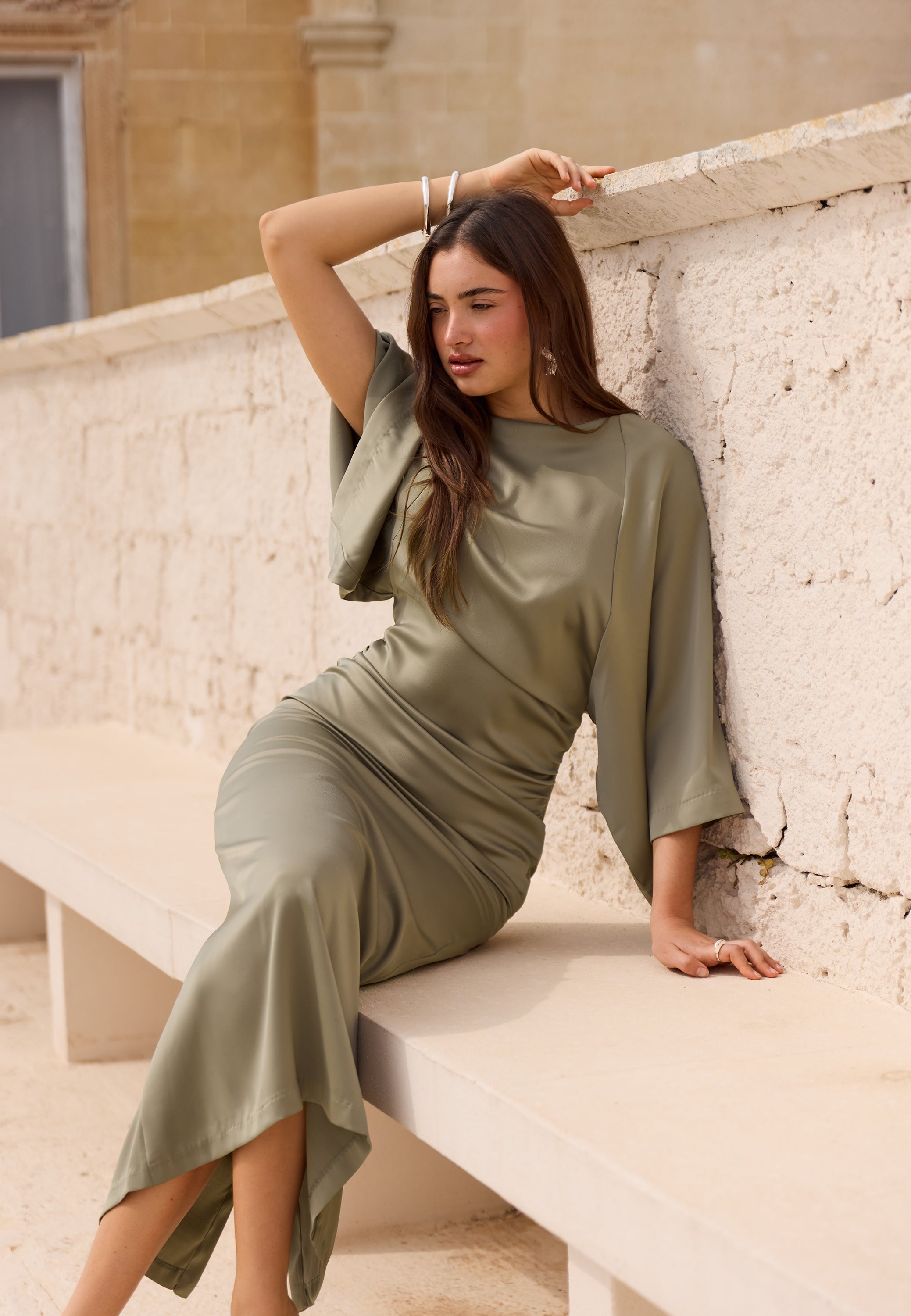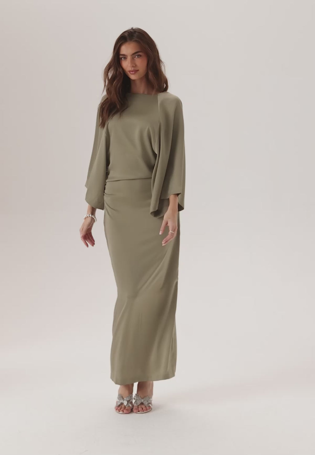 Denne satin-maxikjole er et nemt valg til bryllupper, formelle middage og andre festlige anledninger, når du gerne vil have noget elegant, behageligt og lidt anderledes. Den bløde salviegrønne tone, det flydende ankellange snit og de brede ærmer giver et rent og yndefuldt udtryk, mens rynkerne i siden skaber en diskret markering af talje og hofter.